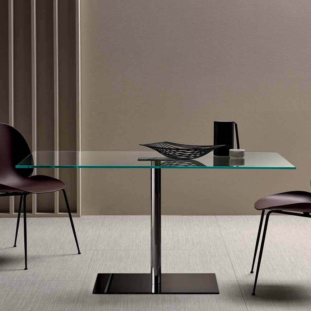 Mesa de comedor rectangular de lujo con sobre de cristal extra claro o ahumado y base de metal, hecho en Italia.