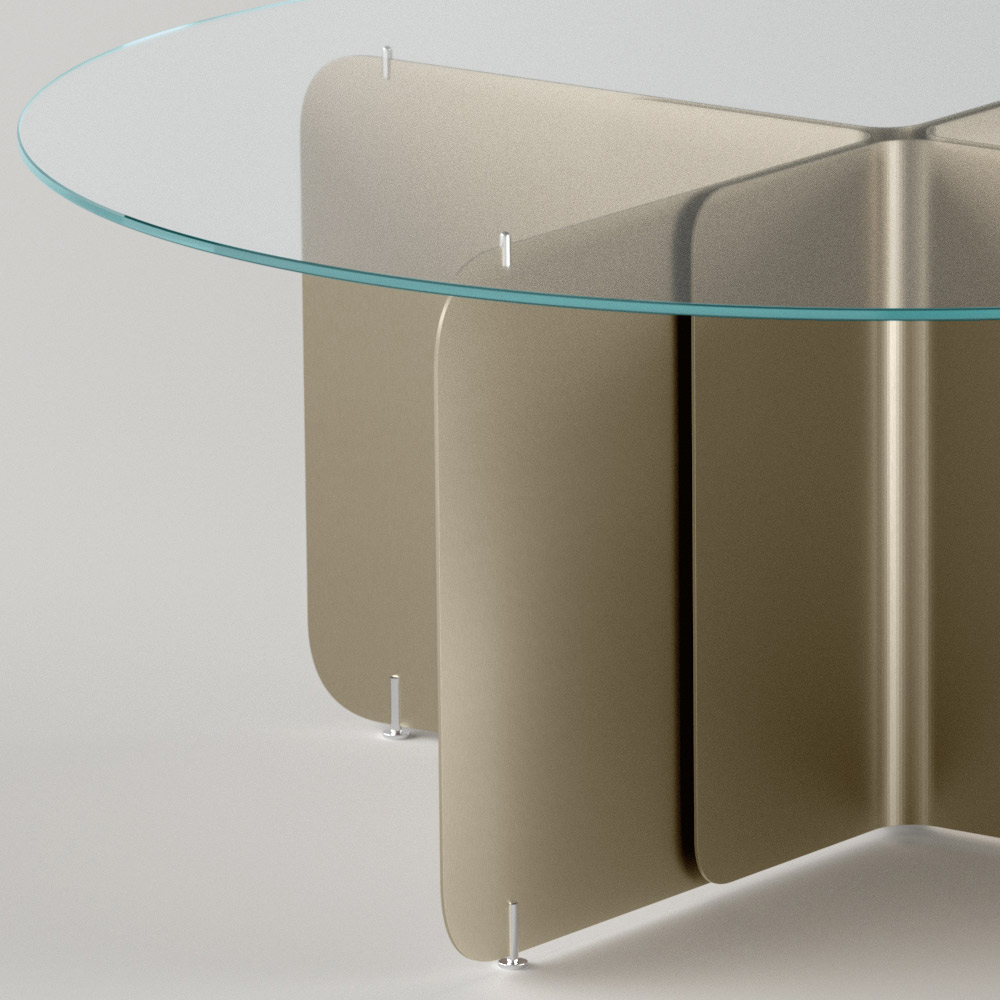 Esta mesa es una encantadora fusión de elegancia minimalista y funcionalidad contemporánea , perfecta para quienes buscan un mueble distintivo pero discreto. La superficie de vidrio transparente ofrece una vista completa de las estructuras inferiores, mostrando las bases geométricas en tonos champán.