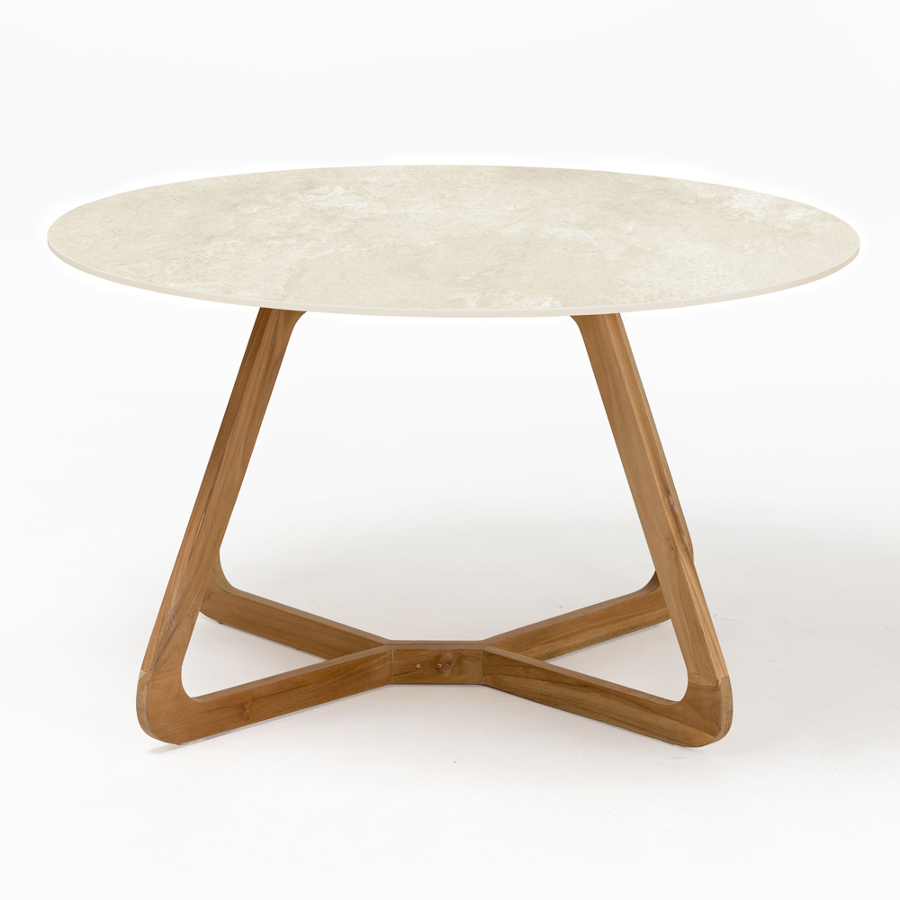 Mesa de exterior realizada con base de madera maciza de teca natural (35 mm de espesor), tablero cerámico gres infinity (12 mm de espesor) con acabado mate Chianca di Ostuni y subestructura en contrachapado marino Okumé , íntegramente Made in Italy.