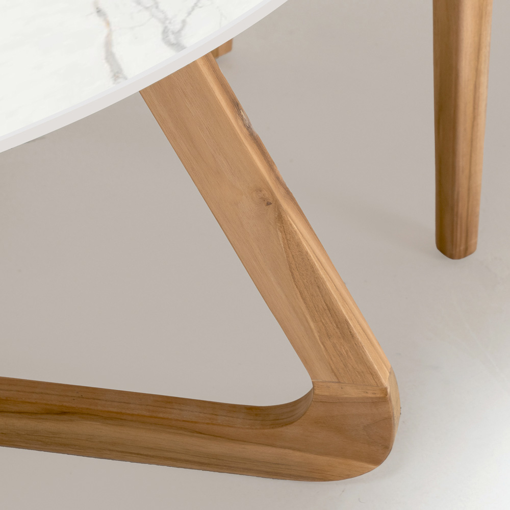 La base de madera no solo sostiene firmemente el robusto tablero de cerámica, sino que también aporta un toque de calidez natural, creando un cautivador contraste visual con el lustroso tablero de mármol. Esta combinación no solo es estéticamente agradable , sino que también ofrece durabilidad y resistencia a la intemperie , lo que la convierte en la mesa ideal para el uso diario en exteriores.