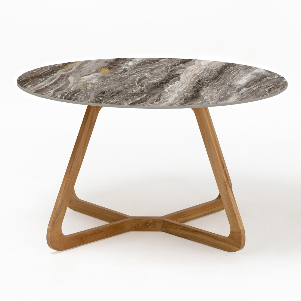 Mesa de exterior realizada con base de madera maciza de teca natural (35 mm de espesor), tablero de cerámica gres infinity (12 mm de espesor) con acabado brillante Orobico Luxe y subestructura en contrachapado marino Okumé , íntegramente Made in Italy.