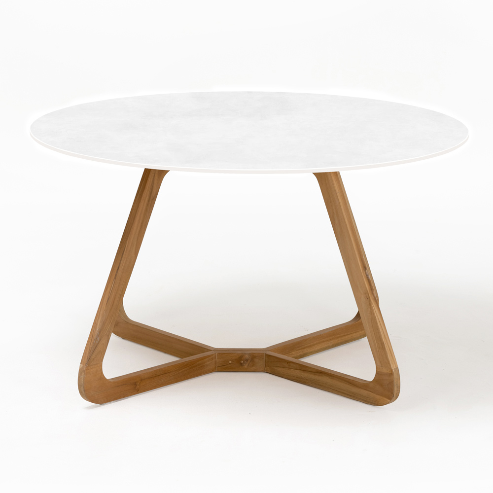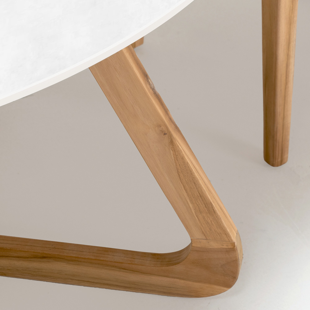 La base de madera aporta un contraste de calidez y textura, equilibrando la frescura del tablero de cerámica con su riqueza y resistencia. Esta combinación de materiales no solo es estéticamente atractiva, sino que también ofrece una durabilidad y resistencia excepcionales a la intemperie, lo que la convierte en la mesa ideal para el uso diario en exteriores.