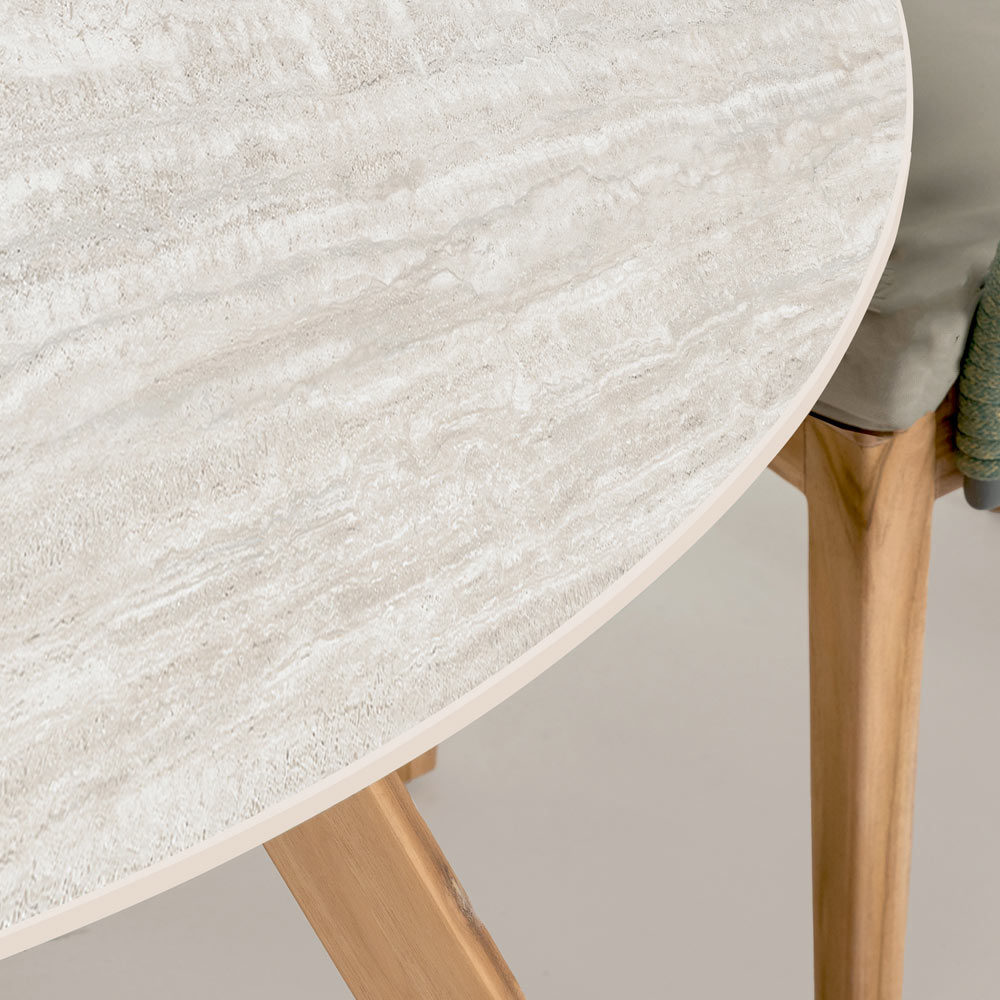 Made in Italy. Esta mesa de exterior es una elección impecable para quienes aprecian la belleza de los acabados naturales atemporales. Combina un tablero de cerámica inspirado en el travertino claro con una base de madera, creando un mueble de exterior tan funcional como atractivo.