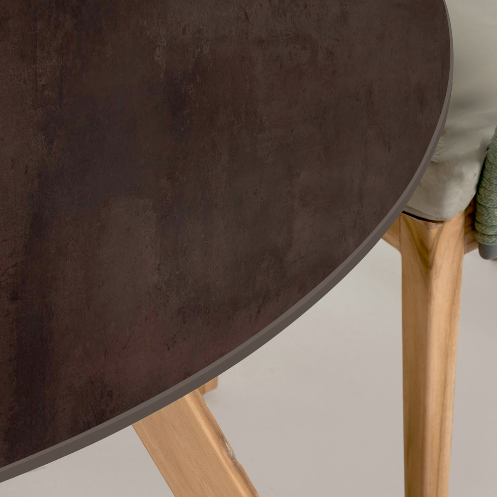 Mesa de exterior realizada con base de madera maciza de teca natural (35 mm de espesor), tablero cerámico gres infinity (12 mm de espesor) con acabado mate Metal Corten y subestructura en contrachapado marino Okumé , íntegramente Made in Italy.