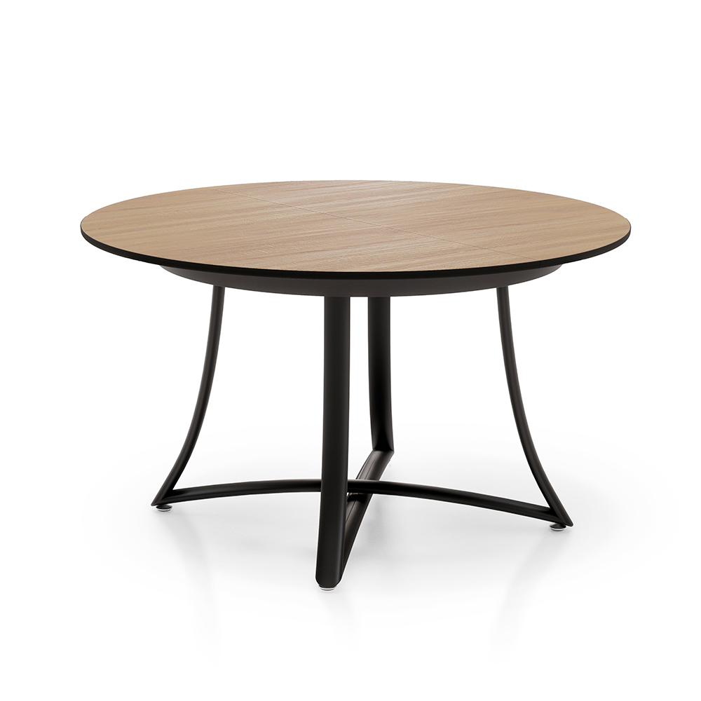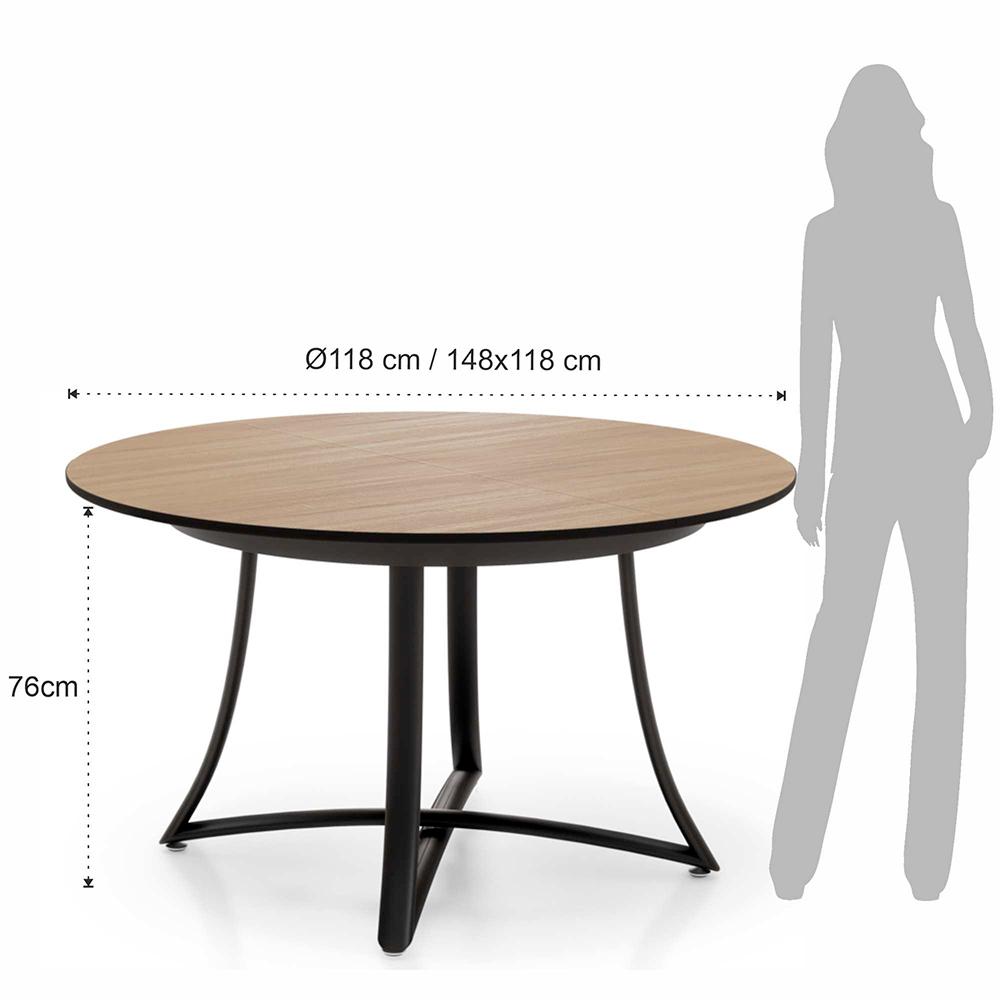 Esta mesa redonda extensible es un ejemplo perfecto de diseño moderno que combina funcionalidad y estilo. Con un tablero de madera, esta mesa transmite un ambiente cálido y acogedor, mientras que la base de metal negro ofrece un fuerte contraste visual que aporta un toque de elegancia contemporánea al conjunto.