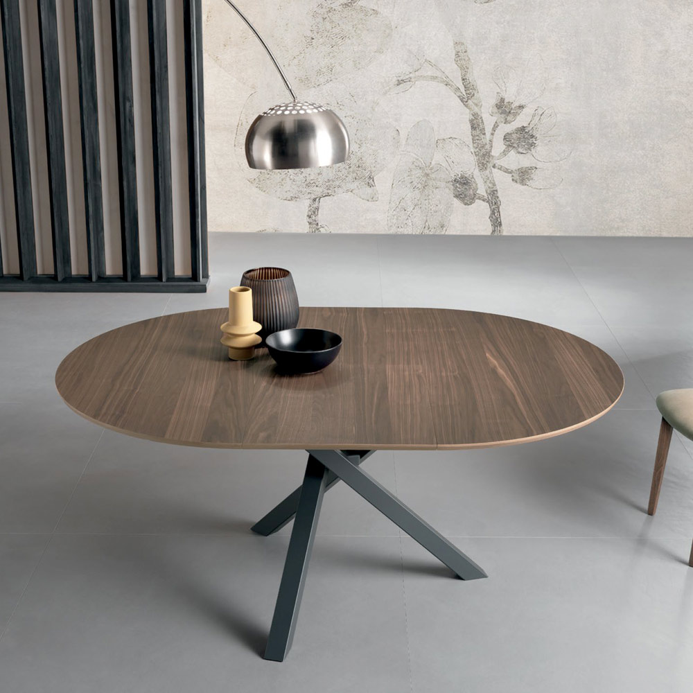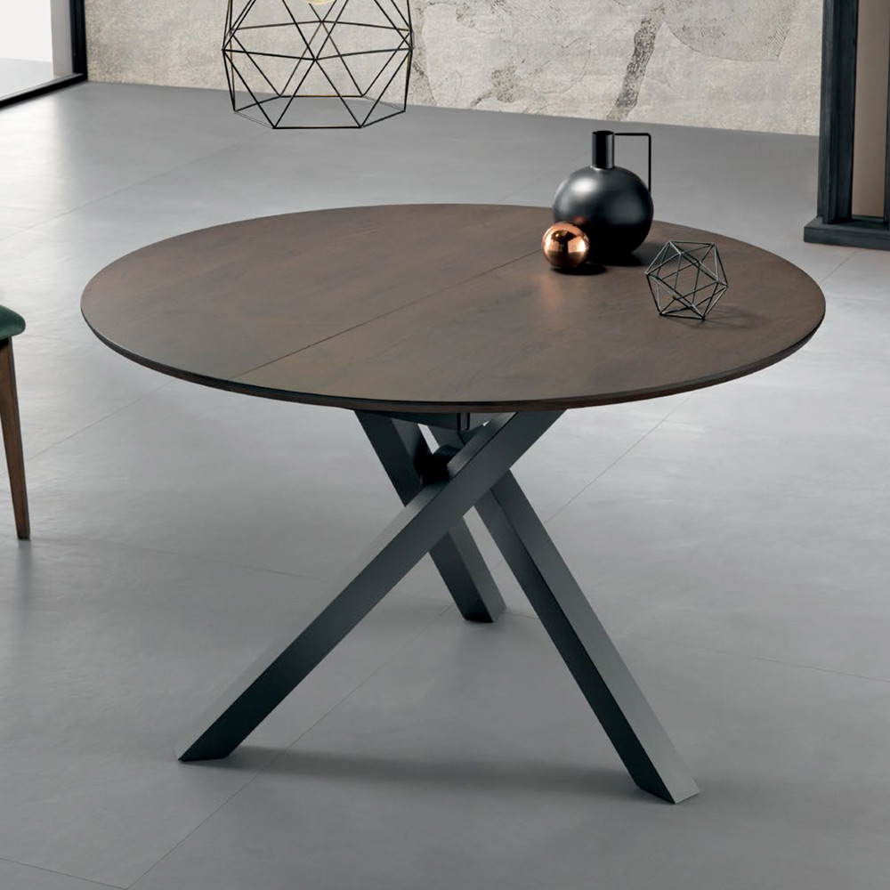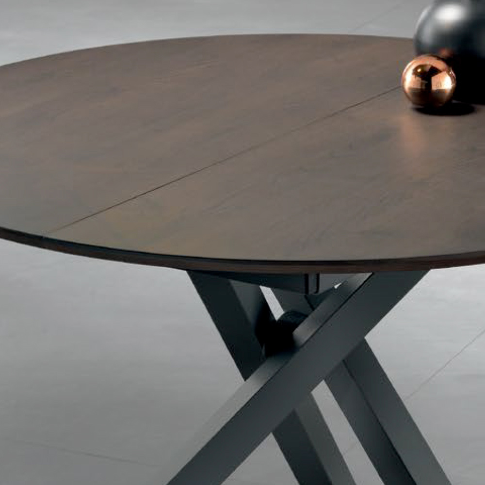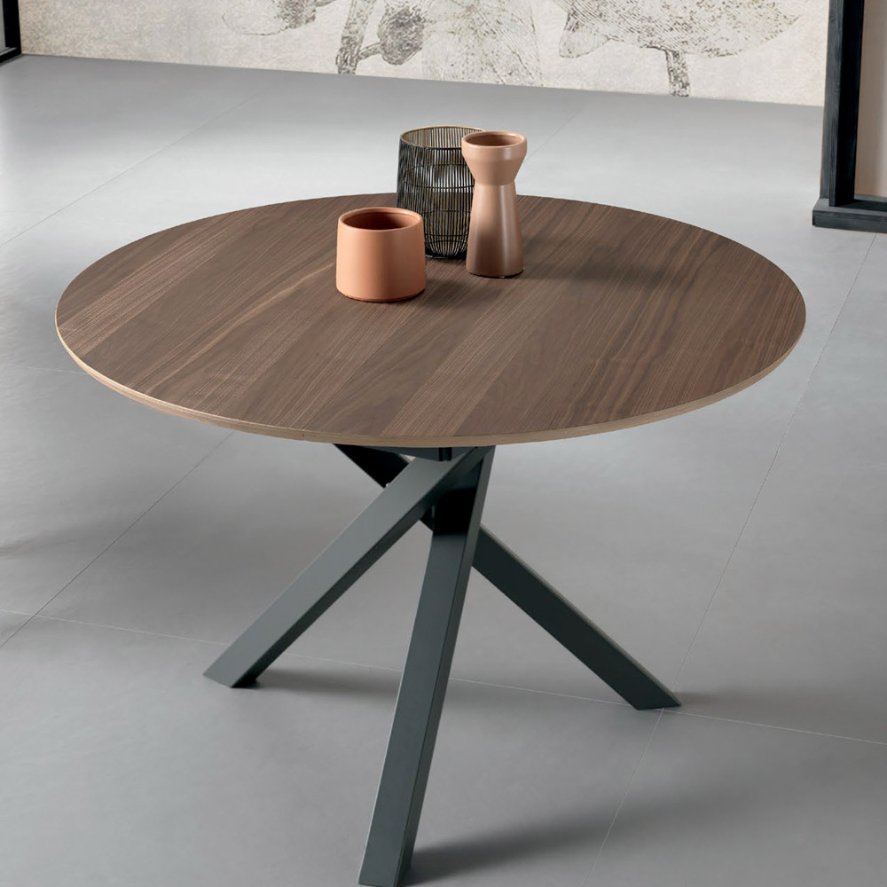 Mesa redonda de 120 cm de diámetro extensible hasta 170 cm, con tablero chapado en nogal Canaletto de 20 mm de espesor y perfil inclinado.