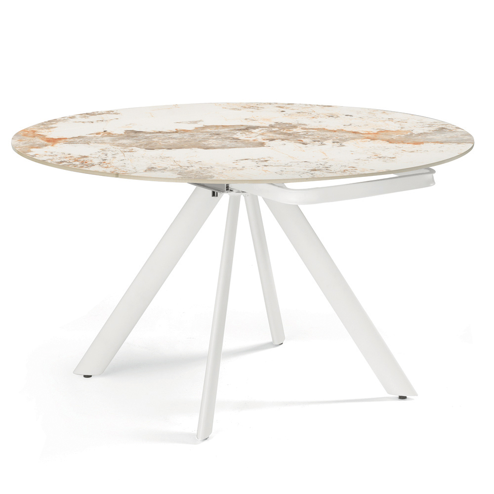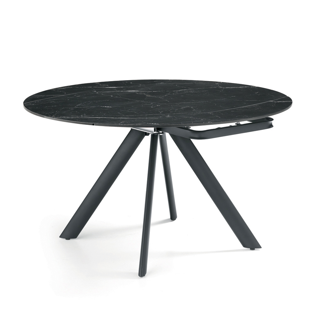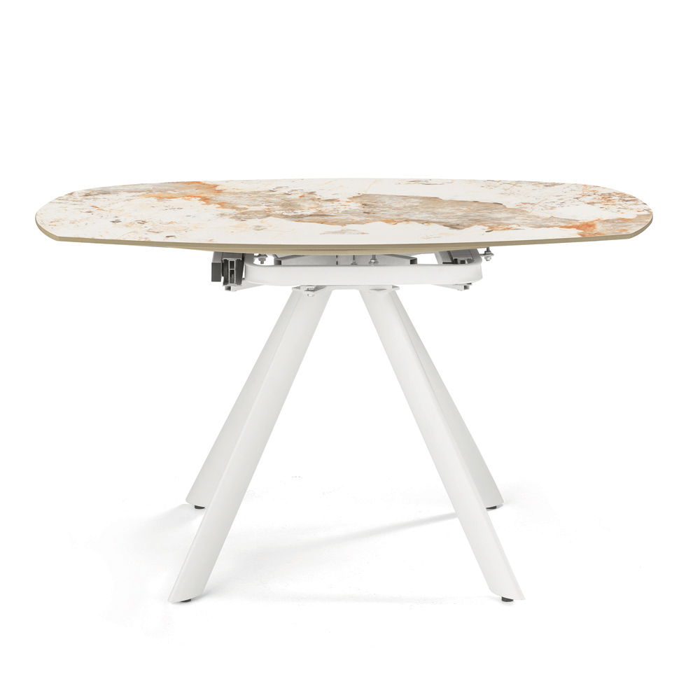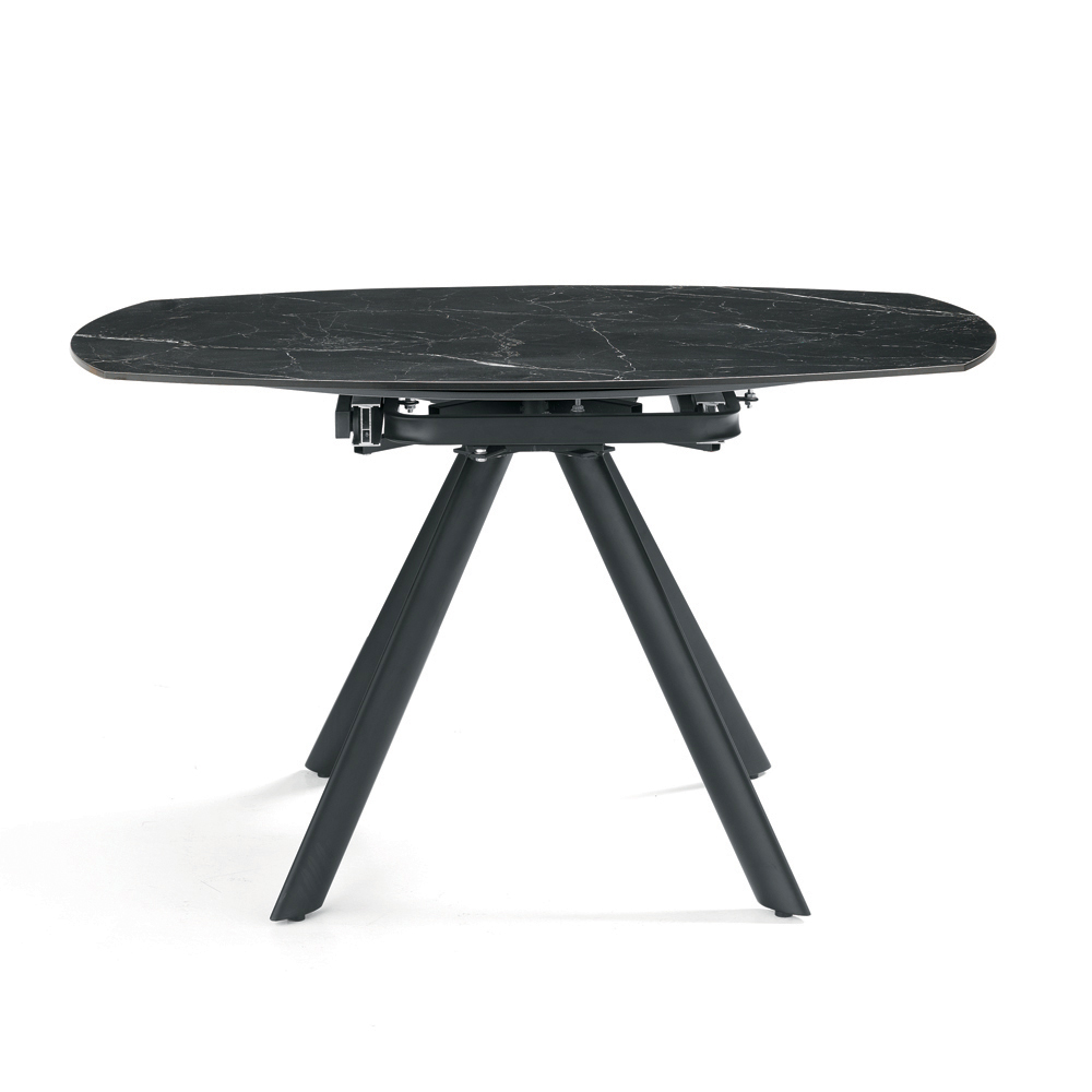 Elegante mesa de comedor extensible, diseñada para amueblar con estilo su sala de estar o comedor . La superficie de piedra sinterizada con efecto mármol ofrece una superficie duradera, refinada y de fácil mantenimiento, perfecta para el uso diario.