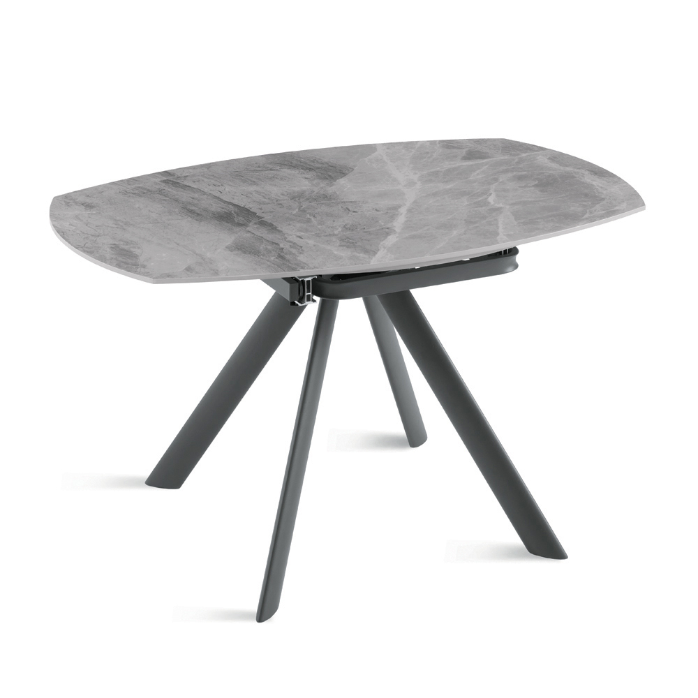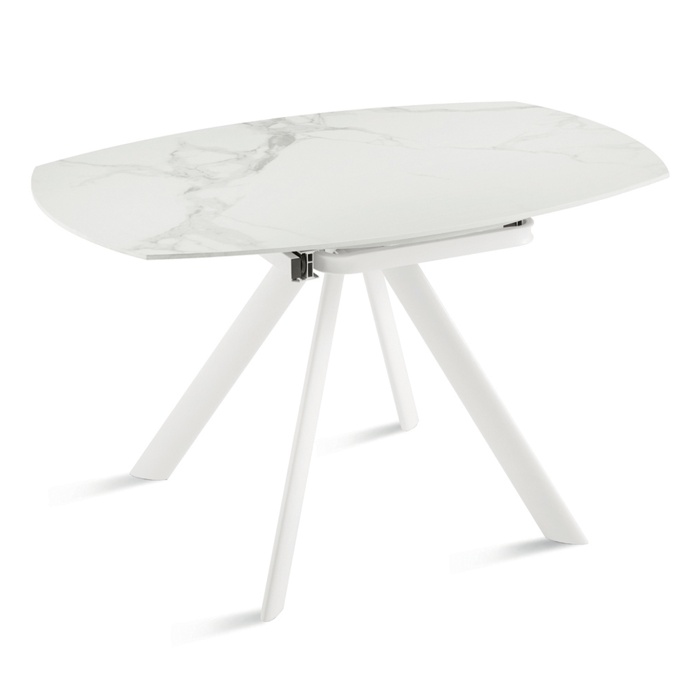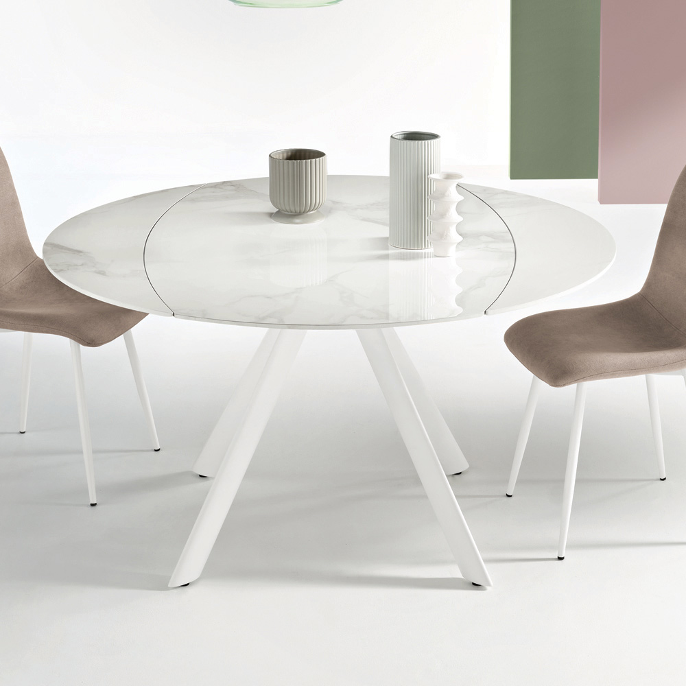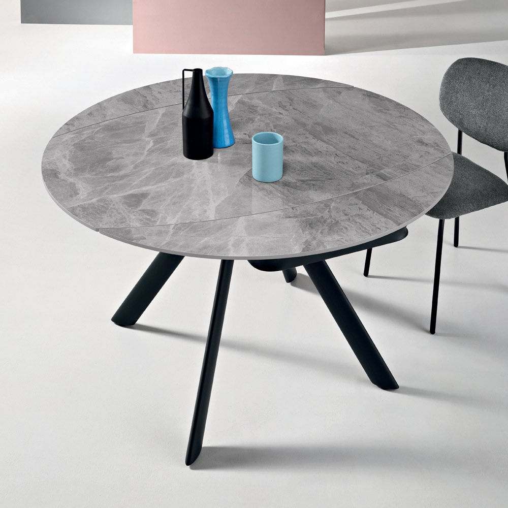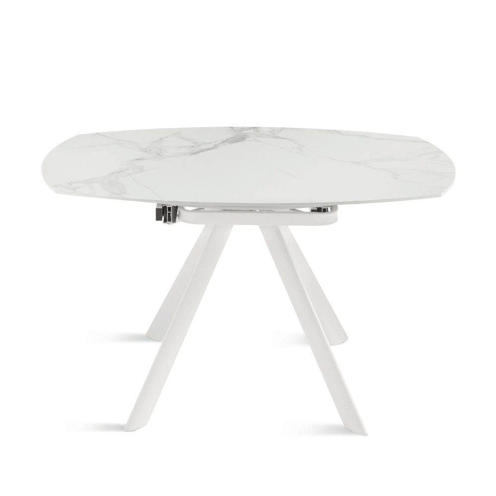 Elegante mesa de comedor extensible, diseñada para amueblar con estilo su sala de estar o comedor . La superficie de piedra sinterizada con efecto mármol ofrece una superficie duradera, refinada y de fácil mantenimiento, perfecta para el uso diario.