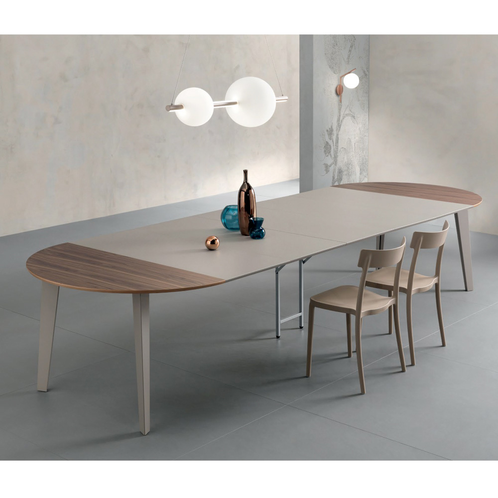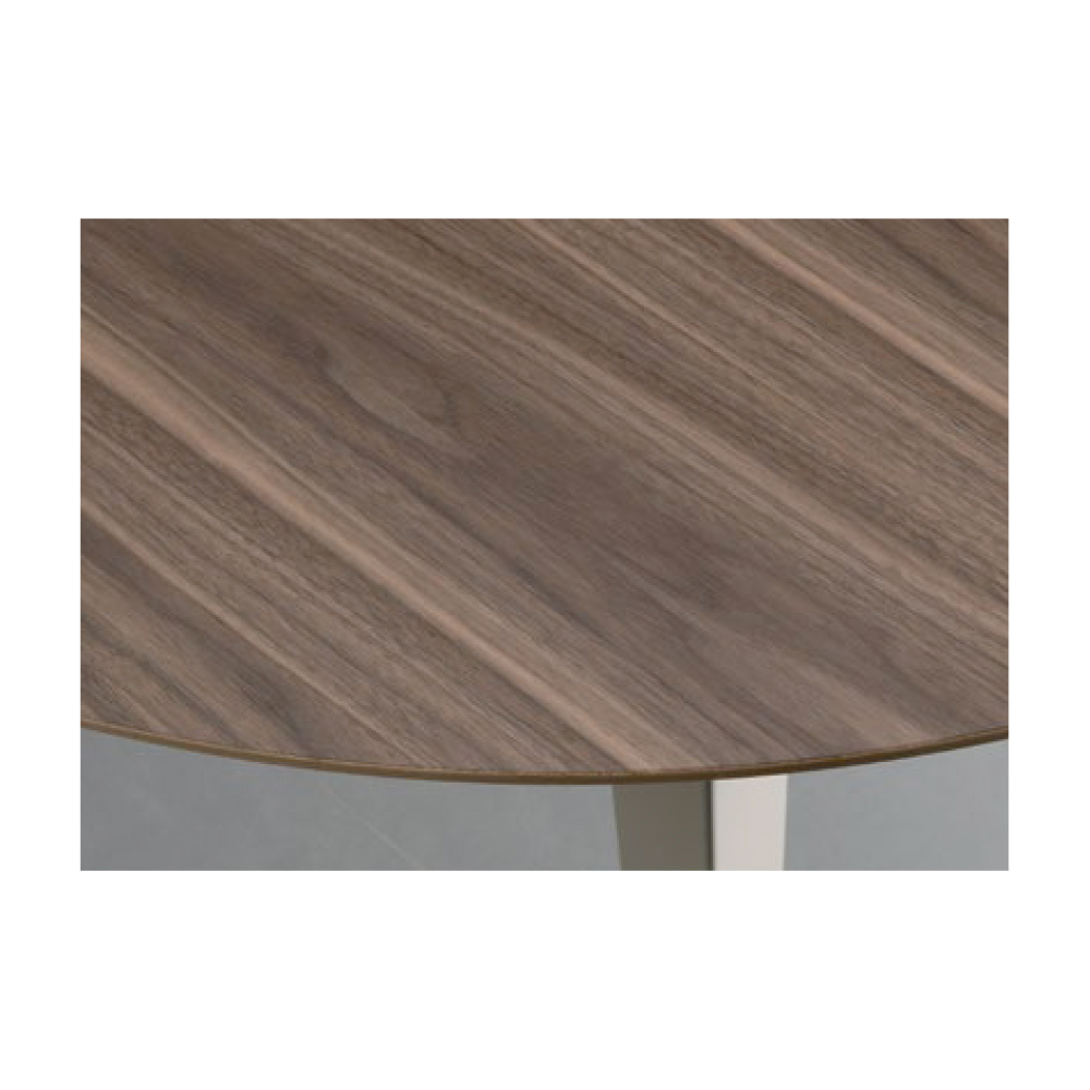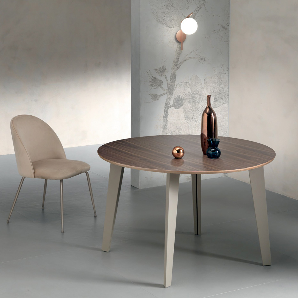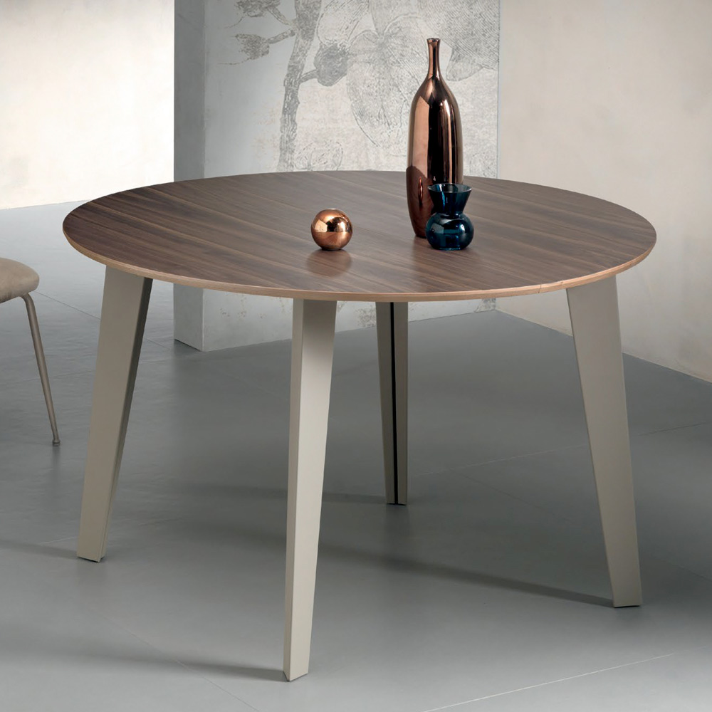 Mesa redonda de 120 cm de diámetro extensible a 276 o 380 cm, con tablero chapado en nogal Canaletto de 20 mm de espesor y perfil inclinado.