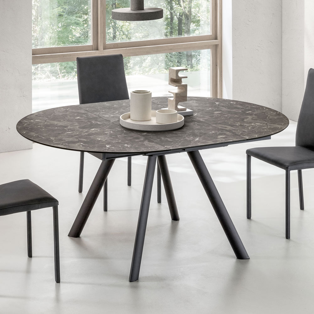 La superficie de HPL aporta luminosidad y refinamiento al ambiente, evocando las vetas de la piedra con una superficie resistente . Gracias al sistema de extensión central , la mesa se extiende fácilmente, ofreciendo espacio adicional para invitados o almuerzos familiares, manteniendo una línea armoniosa incluso abierta.