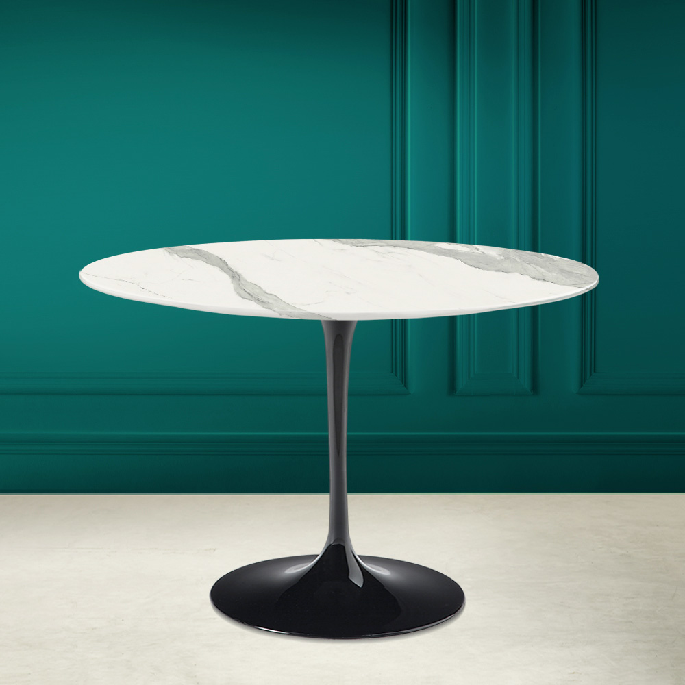 Mesa de comedor con tapa redonda en cerámica estatuaria a toda vena y base de aluminio pulido Made in Italy