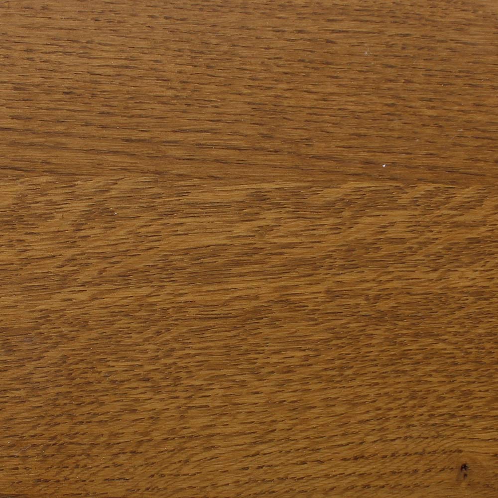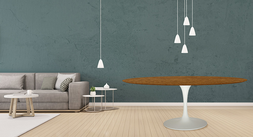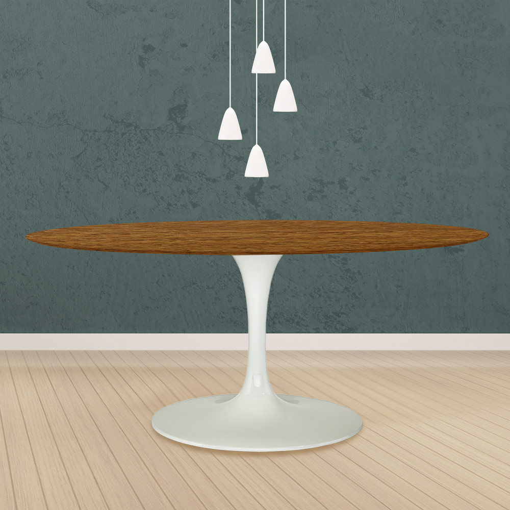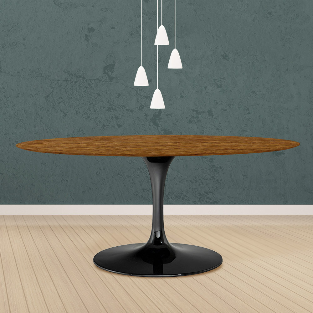 forma ovalada y el tablero de roble teñido de nogal claro confiere a esta mesa un