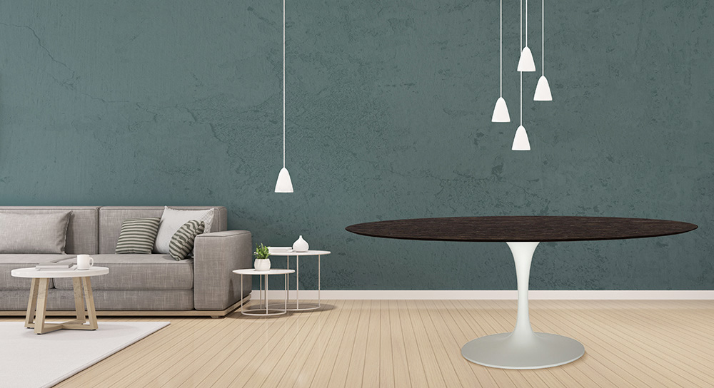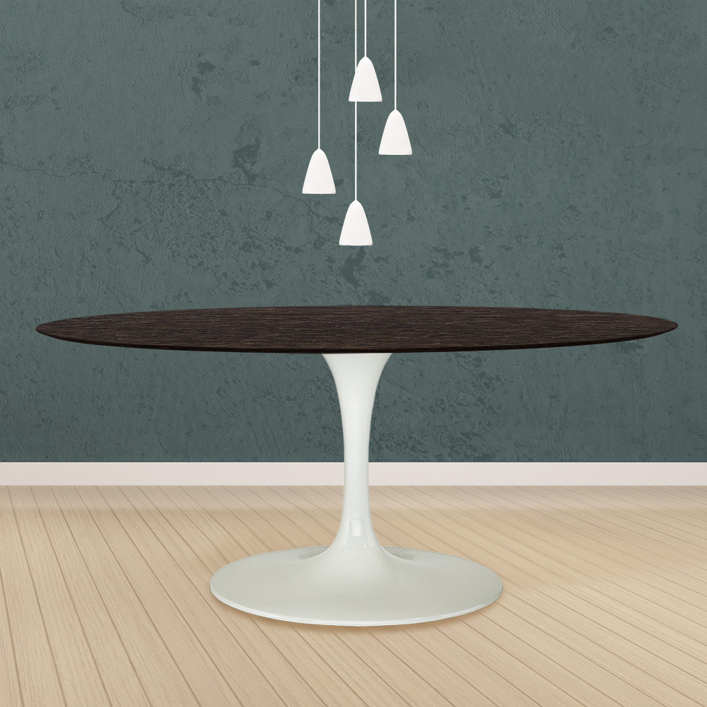 forma ovalada y el sobre de roble teñido moka confiere a esta mesa un