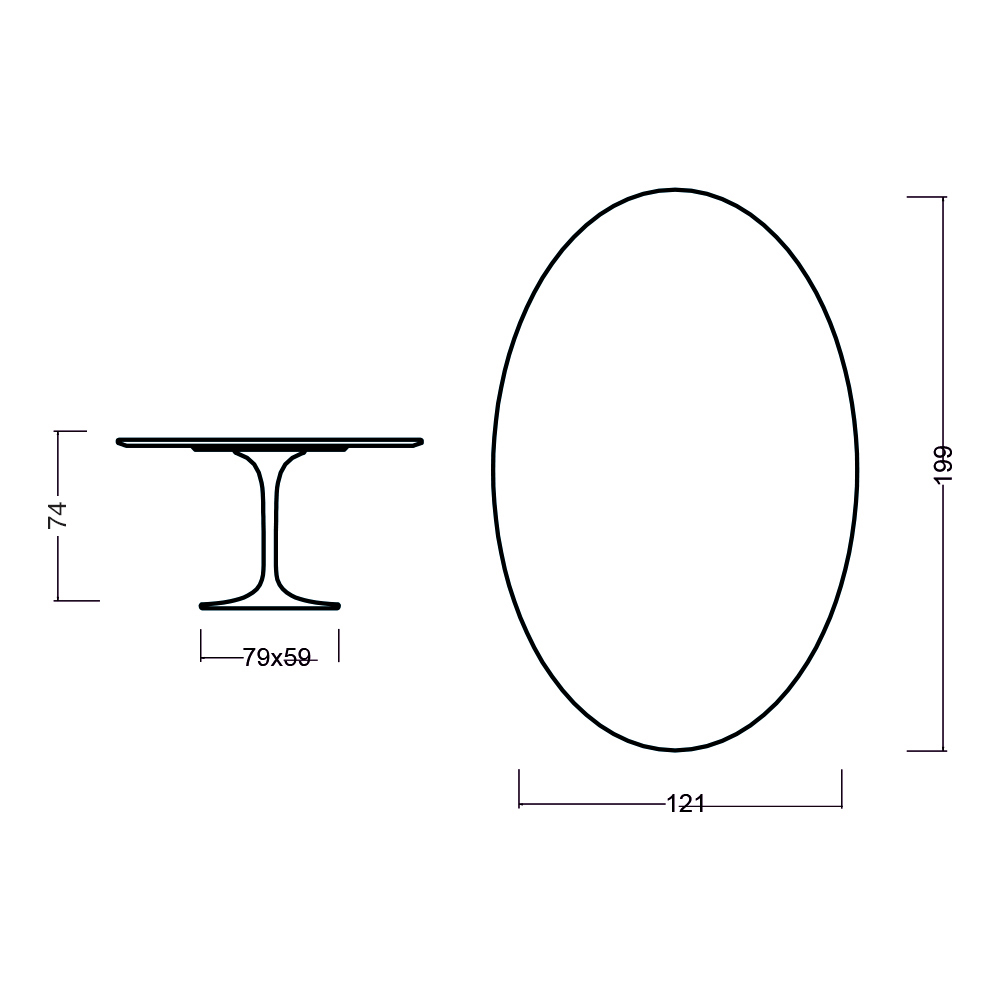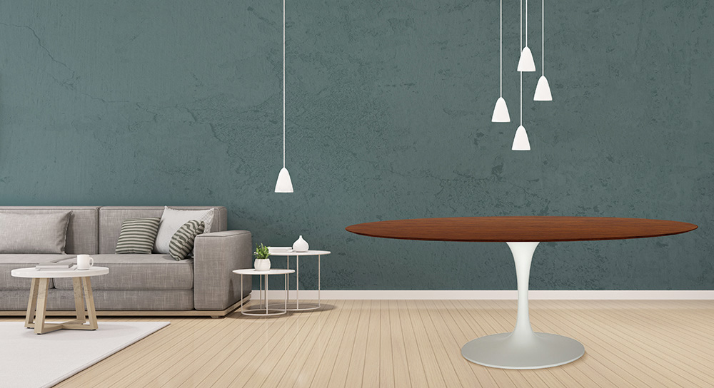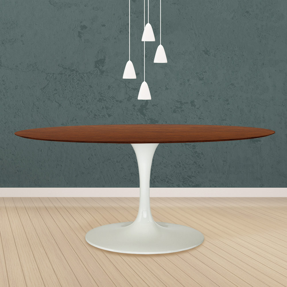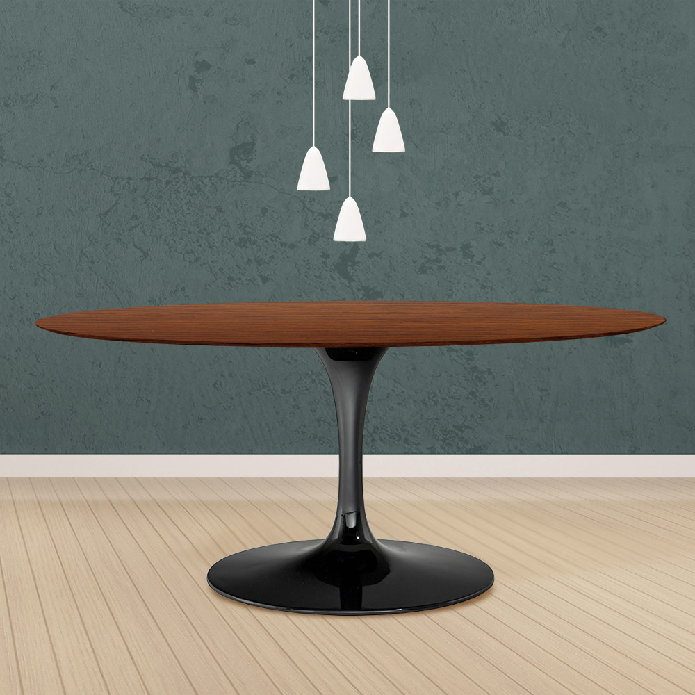 forma ovalada y el sobre de roble teñido de nogal oscuro confiere a esta mesa un