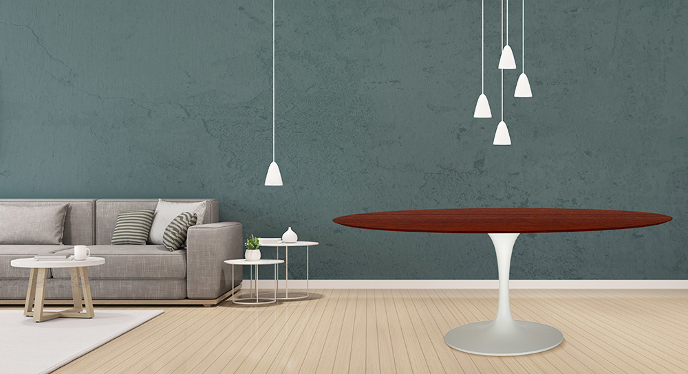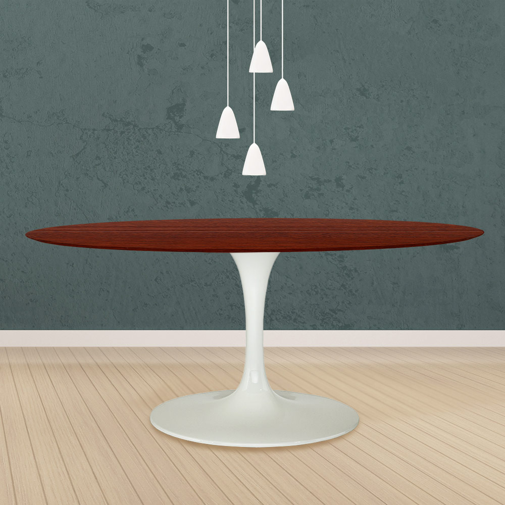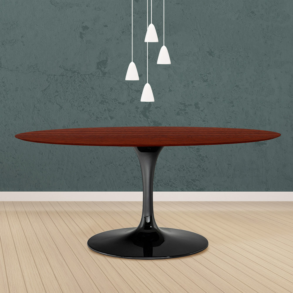 forma ovalada y el tablero de roble teñido de palisandro confiere a esta mesa un