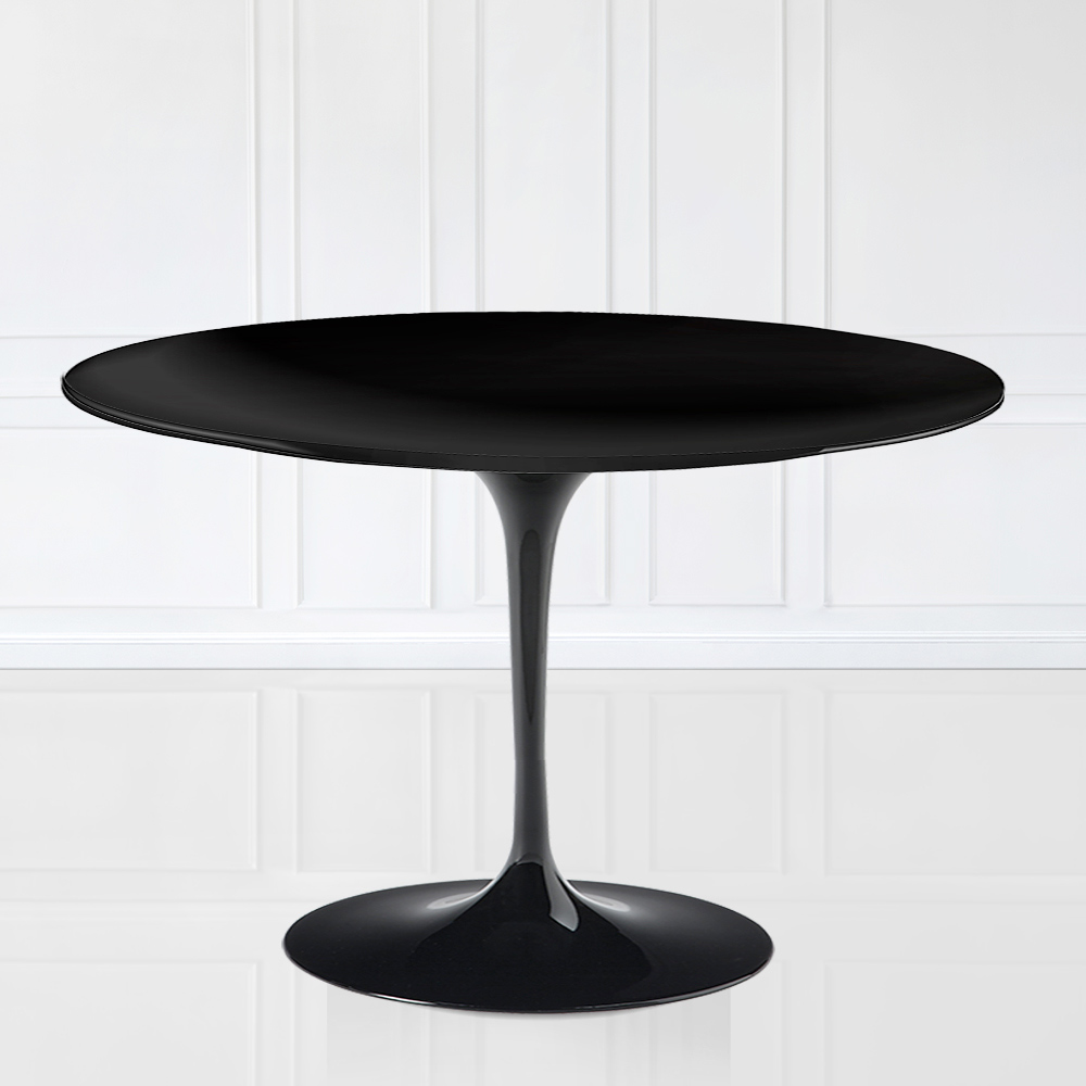 Mesa de comedor redonda con tapa de laminado líquido negro y base de aluminio pulido negro Made in Italy