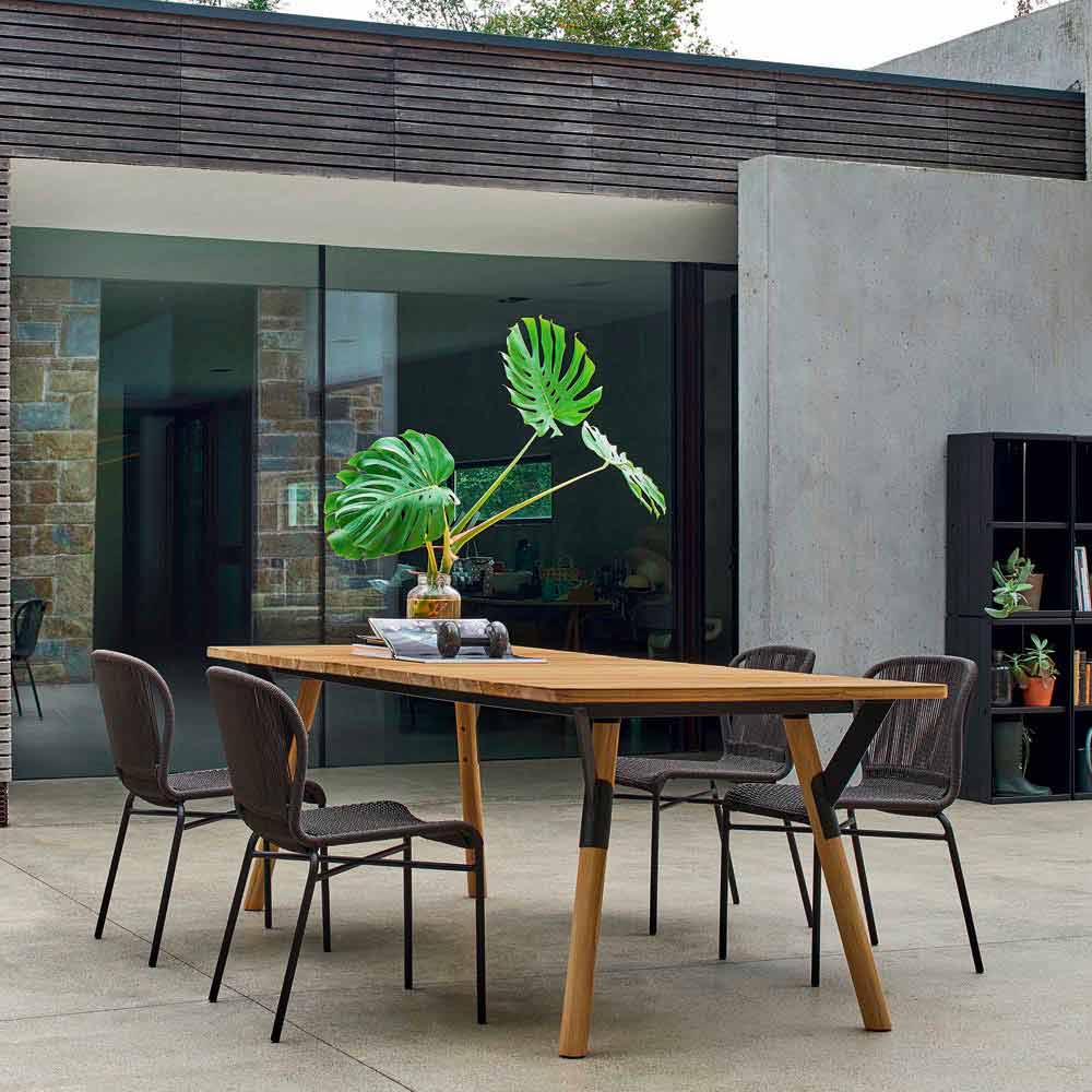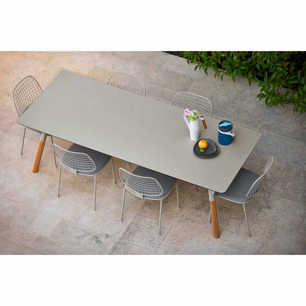 Link es una mesa con un diseño moderno con marco de acero inoxidable y patas de madera de teca pintadas. El plan está disponible en HPL (espesor 12 mm) o de madera de teca (espesor 30 mm). Con su diseño versátil, que se puede utilizar como mesa al aire libre para amueblar ambientes interiores. diferentes acabados están disponibles con los que personalizar la estructura y el tablero de la mesa.