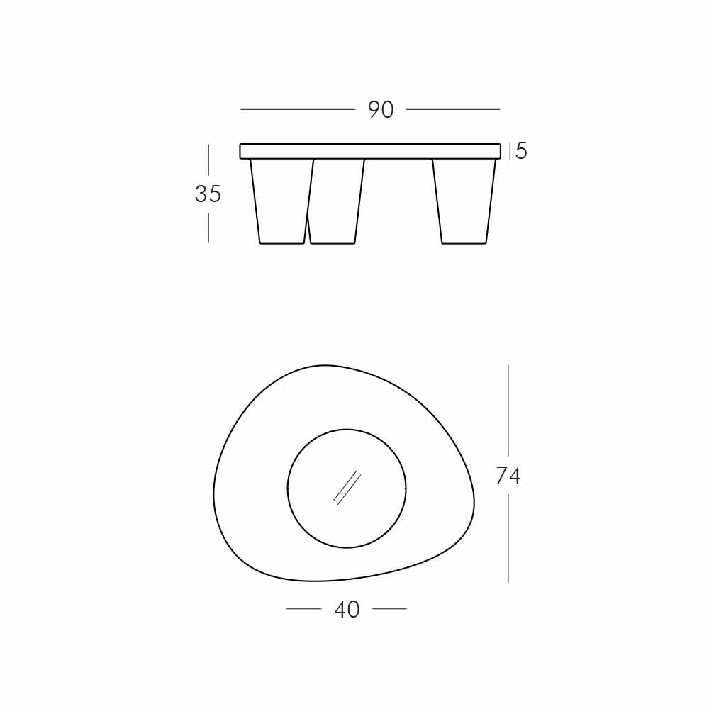 Consta de una estructura con tres patas de polietileno y tapa de cristal templado. Disponible en trece colores diferentes y posibilidad de solicitar también la versión lacada con posibilidad de elegir entre diferentes colores.
