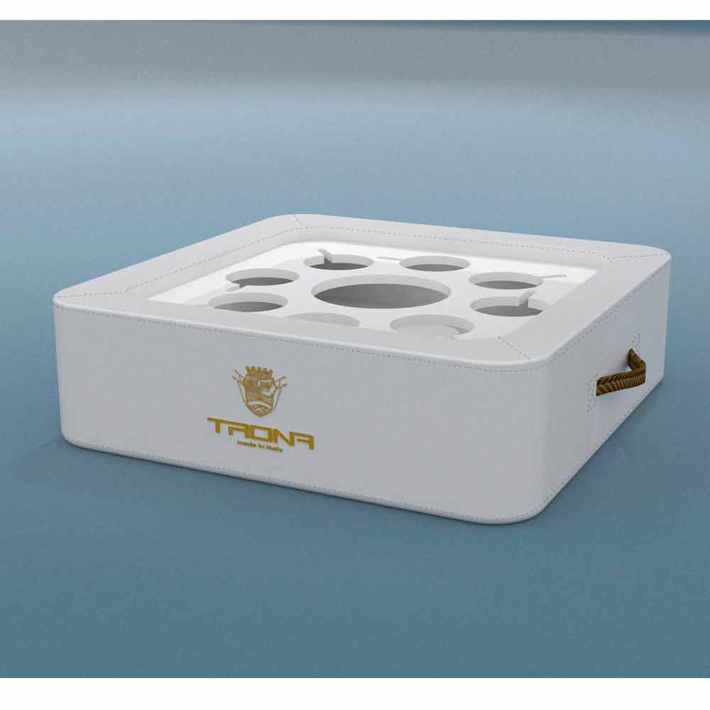Gracias a la plancha de plexiglás perforada, Trona puede sostener de una manera segura tanto vasos como botellas. Trona presenta un agujero central y 8 agujeros para colocar vasos o copas de cocktail.