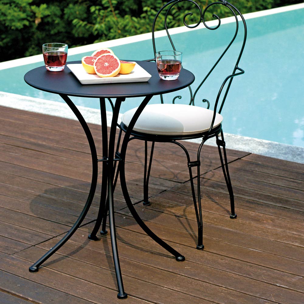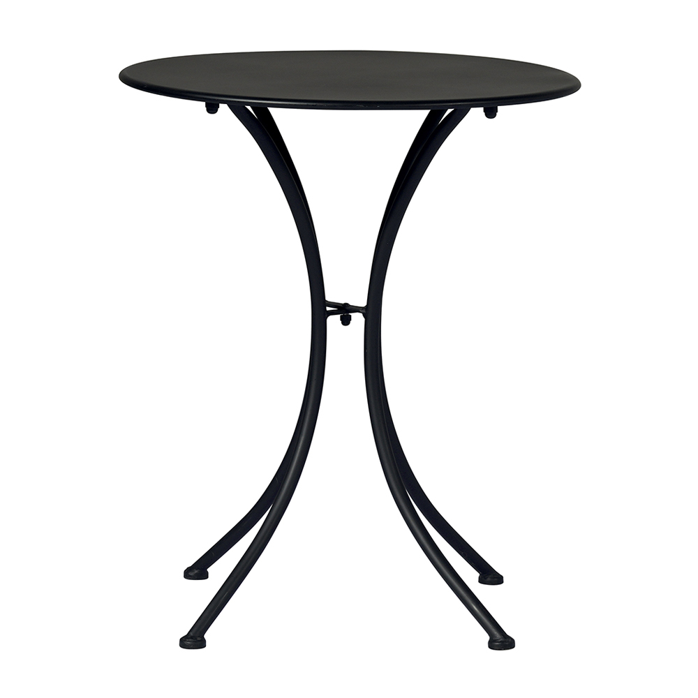 Mesita de exterior redonda con estructura y tapa en hierro negro.