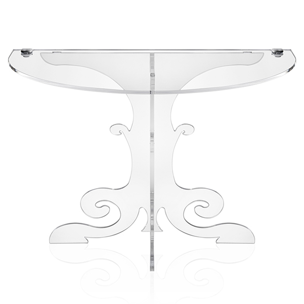 La mesita de noche TIANA está inspirada en las consolas de pared Luis XVI de finales del siglo XVIII, reinterpretadas con el más tecnológico de los materiales transparentes: cristal acrílico 100% PMMA procedente de polímero virgen.