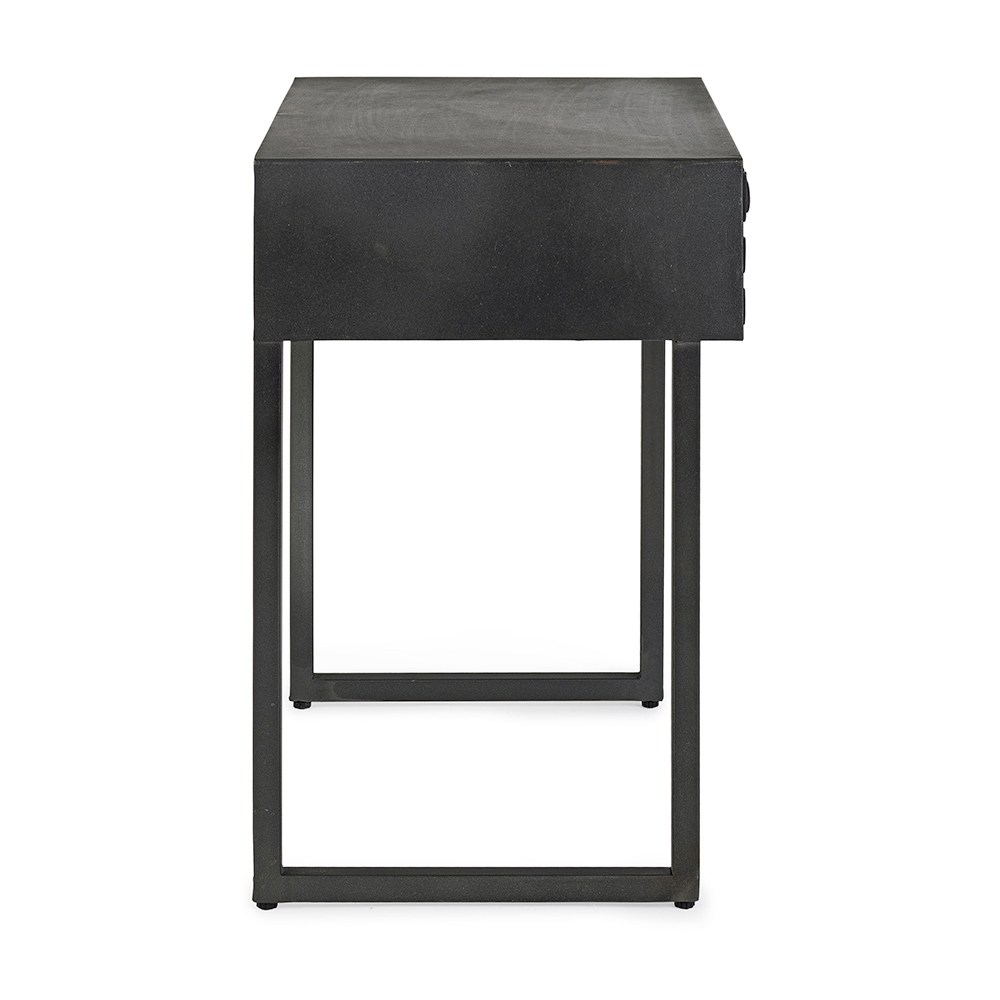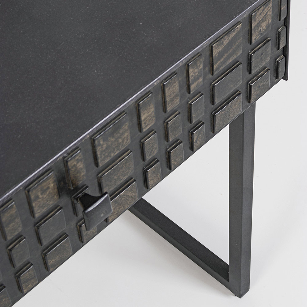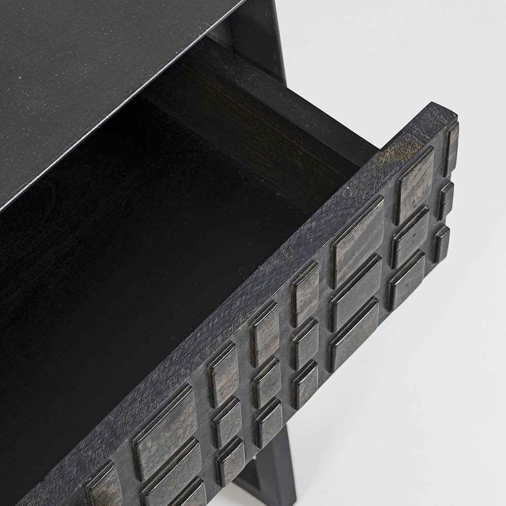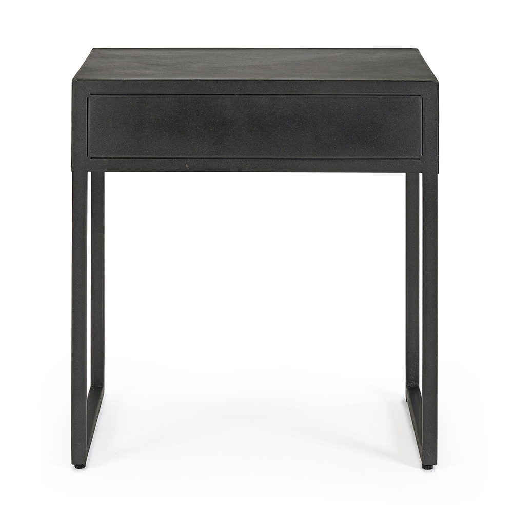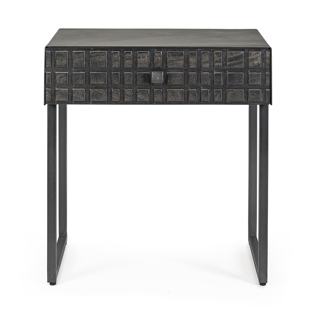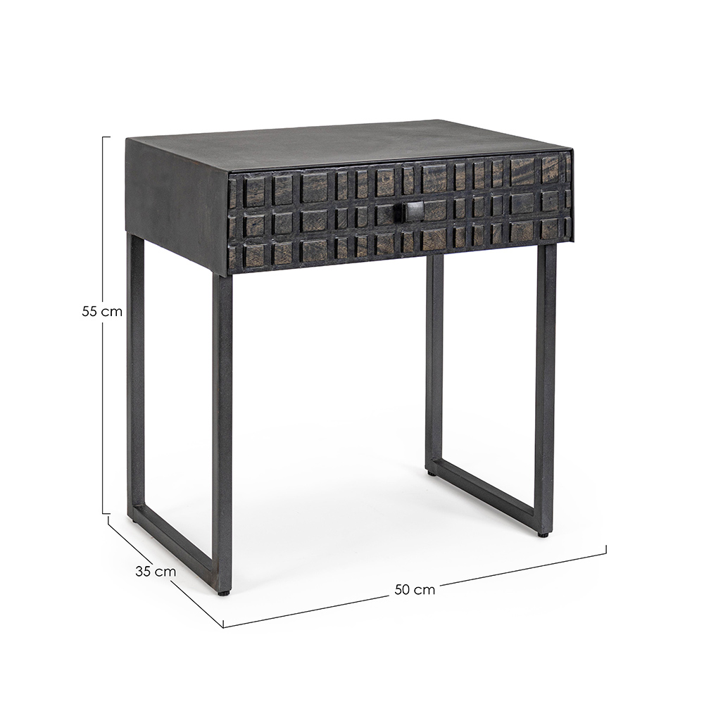 Mesita de noche en acero con cajón en madera de mango de diseño étnico.