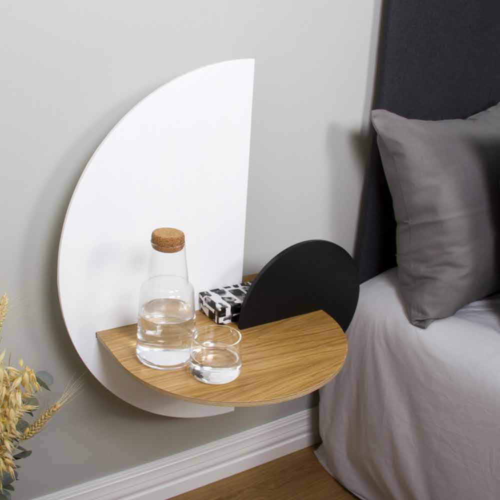 Lo que caracteriza a esta mesita de noche es su diseño innovador y original capaz de revolucionar el mobiliario de cualquier dormitorio que necesite un toque de personalidad y elegancia . Su estructura tiene líneas geométricas simples que le dan al producto singularidad y armonía entre las formas. Su estructura se realiza mediante el uso de 3 paneles de madera contrachapada, uno de ellos en acabado roble fijado a la pared que actúa como una verdadera superficie de apoyo y dos en acabado fresno teñido blanco y negro que se montan sobre él y que permiten hasta 8 configuraciones permitiéndole así obtener un producto que se puede personalizar según sus necesidades.