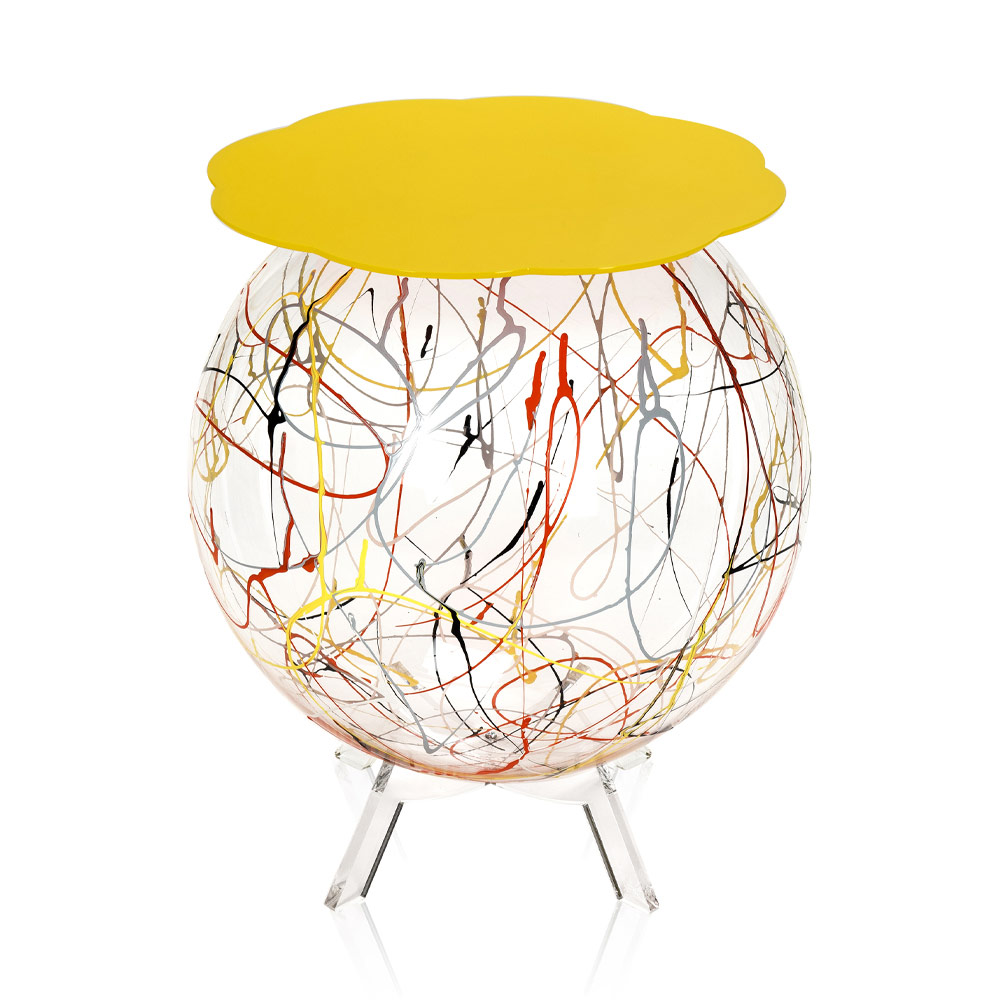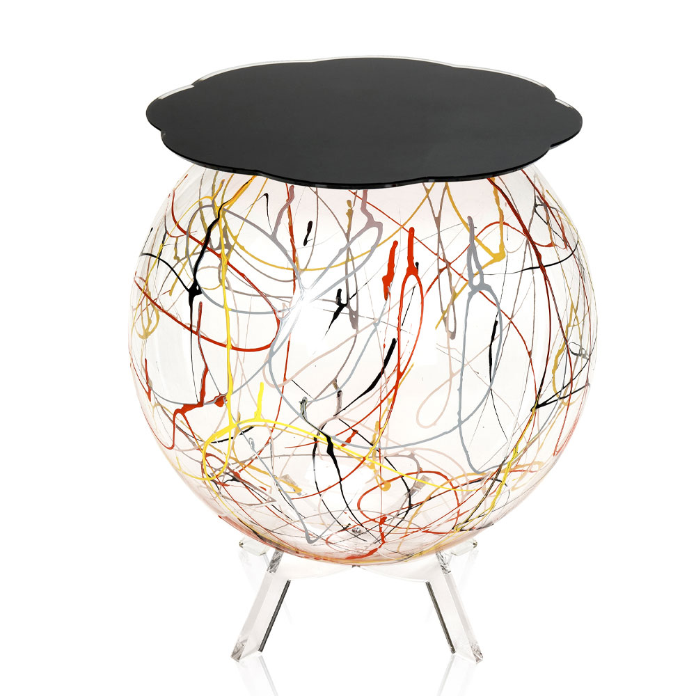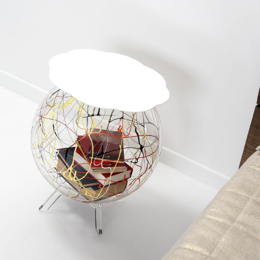 La estructura esférica y ancha está hecha completamente de plexiglás transparente de polímero 100% virgen con un acabado de pintura en aerosol en homenaje a Jackson Pollock y el estante disponible en varios colores. El diseño final es, por tanto, original y fácil de colocar en el hogar.