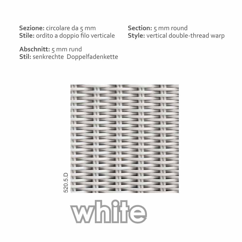 Esta mesa presenta una estructura de aluminio revestida por una estructura de 5 mm realizada en polietileno con un trenzado realizado completamente a mano. Está disponible en dos colores diferentes: color blanco o color miel.