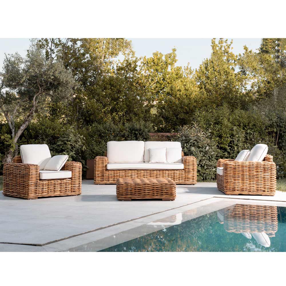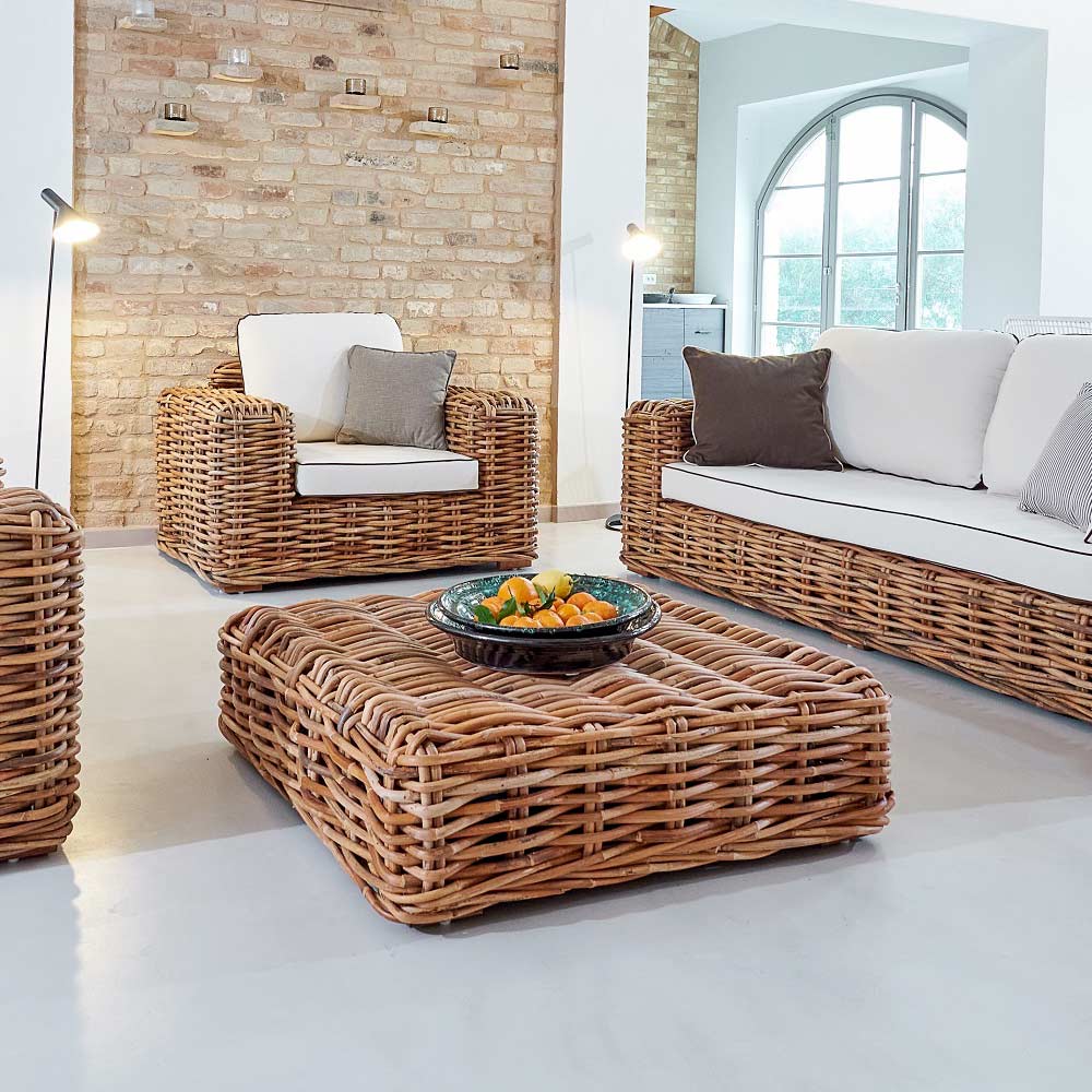 Mesa de centro-pouf de exterior en ratán natural con cojín.