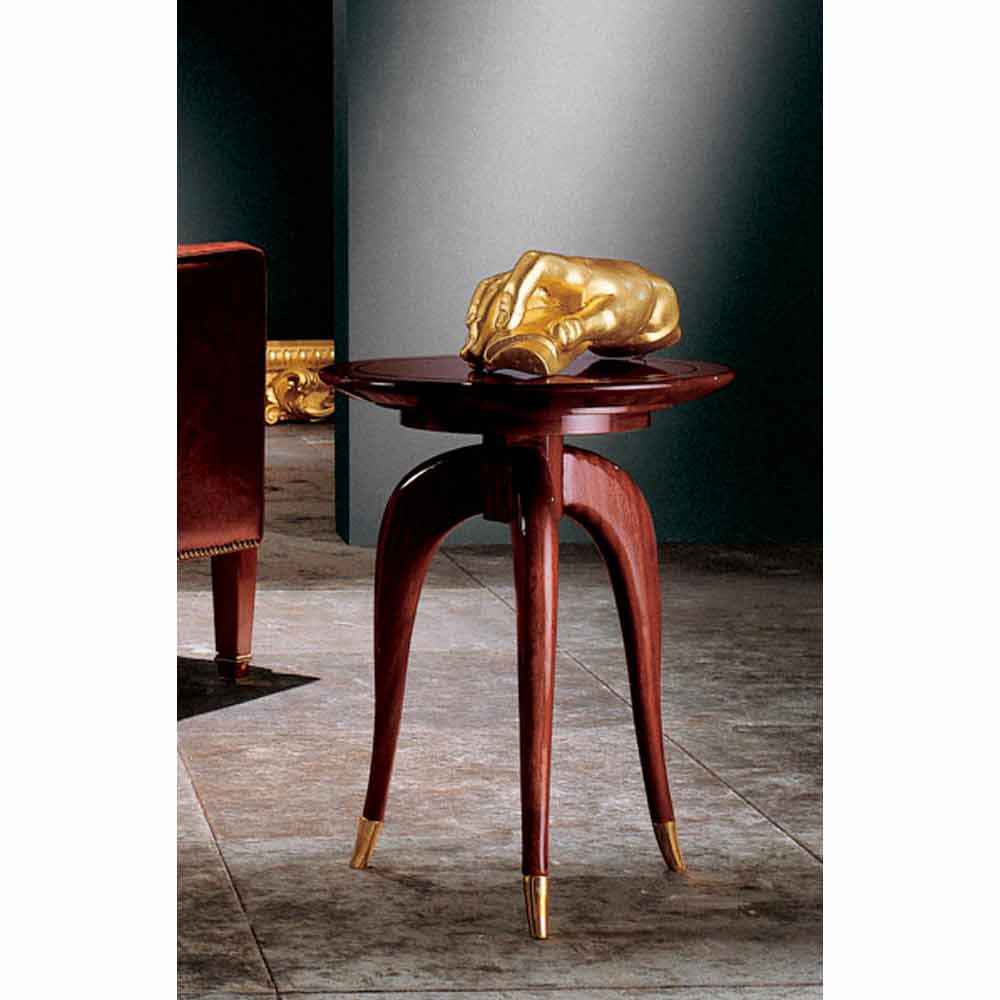 Mesa de centro redonda con 3 patas. Acabado en caoba natural pulida.