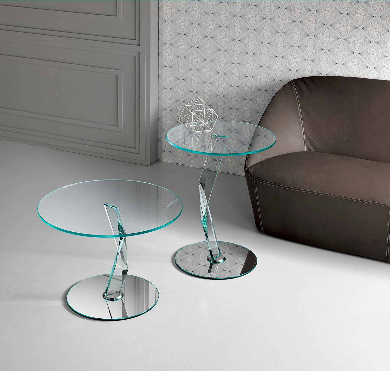Mesa de centro redonda con sobre de vidrio extra claro y base de metal y espejo, hecha a mano en Italia.
