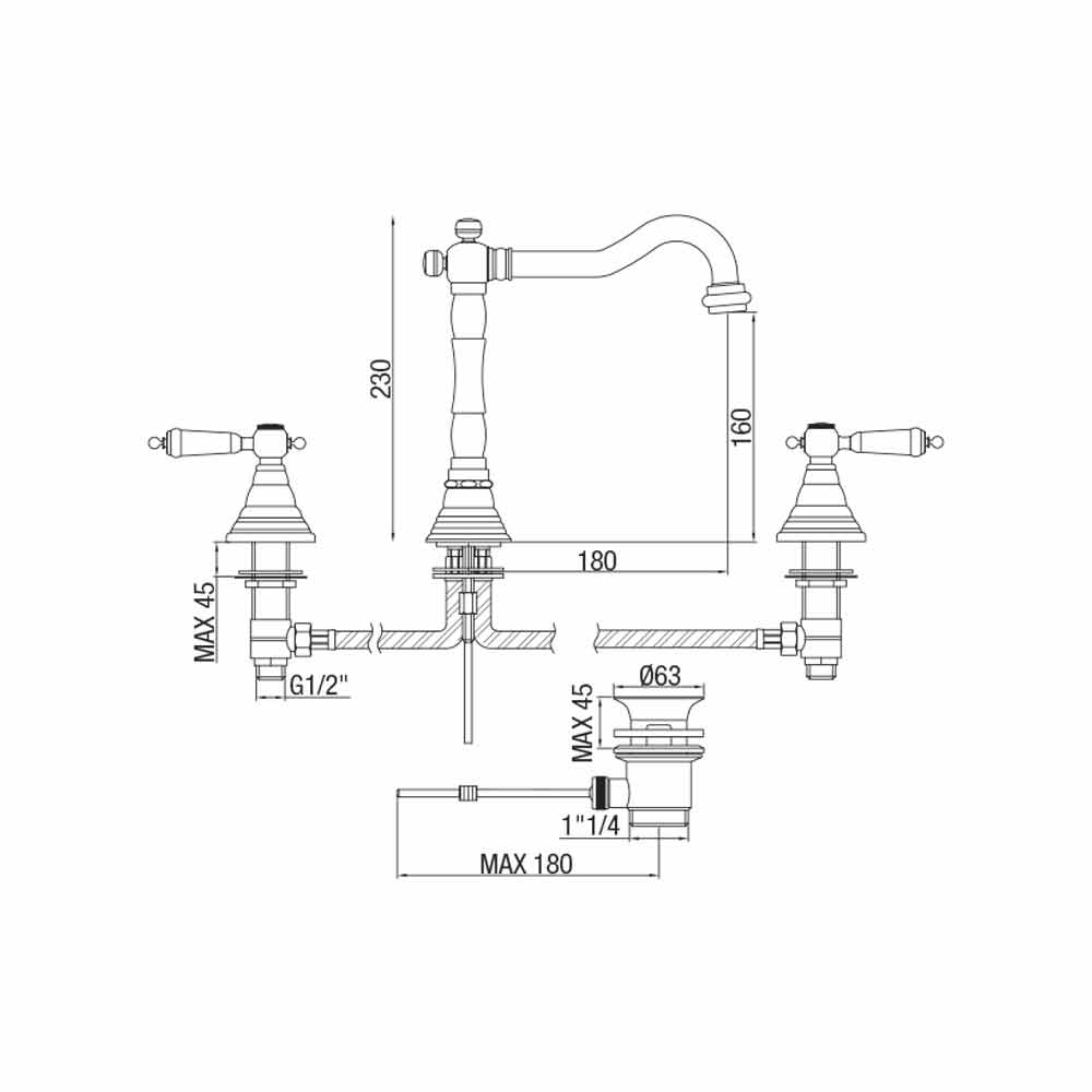 Mezclador de lavabo de latón de diseño clásico con 3 orificios Made in Italy.