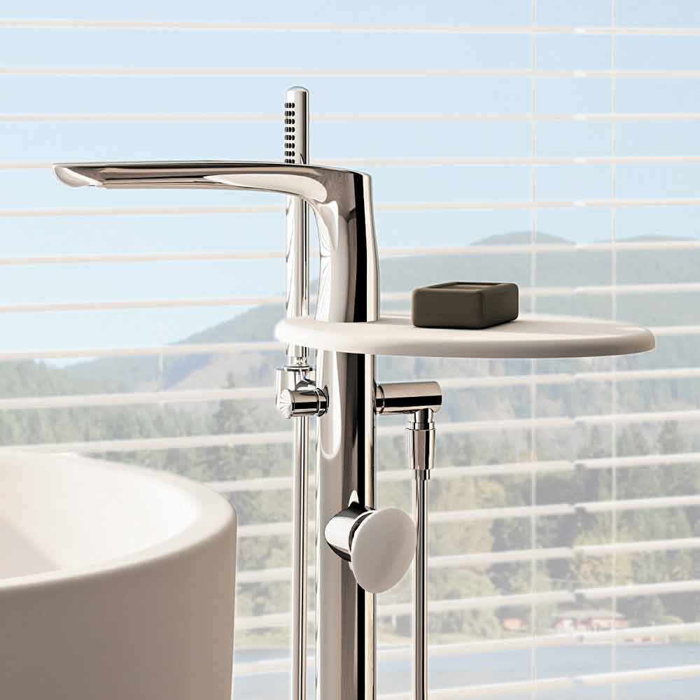 Mezclador de bañera de cubierta con ducha de mano dúplex, desviador y estante en DuPont ™ Corian® Made in Italy.