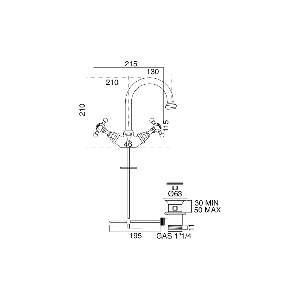Mezclador de caño alto de un orificio en latón, estilo vintage, Elisea, fabricado en Italia.