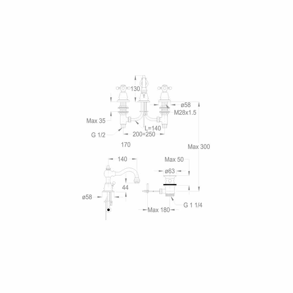 Mezclador de lavabo de sobre encimera de diseño clásico con tres orificios en latón cromado de 130 mm de altura y con un distancia entre ejes de 140 mm con desagüe y palanca abatible.