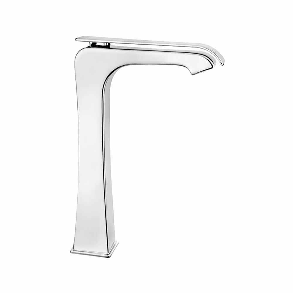 Mezclador de lavabo de sobre encimera de diseño ultramoderno y creativo en latón cromado de 275 mm de altura y con un centro de 135 mm, sin desagüe y sin orificio emergente.