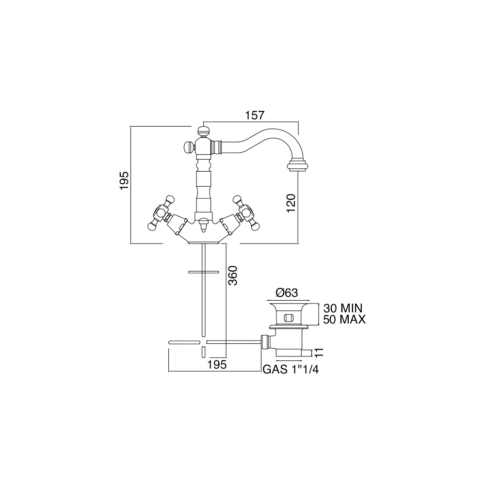 Mezclador de lavabo de un orificio de diseño vintage en latón Ursula, fabricado en Italia.