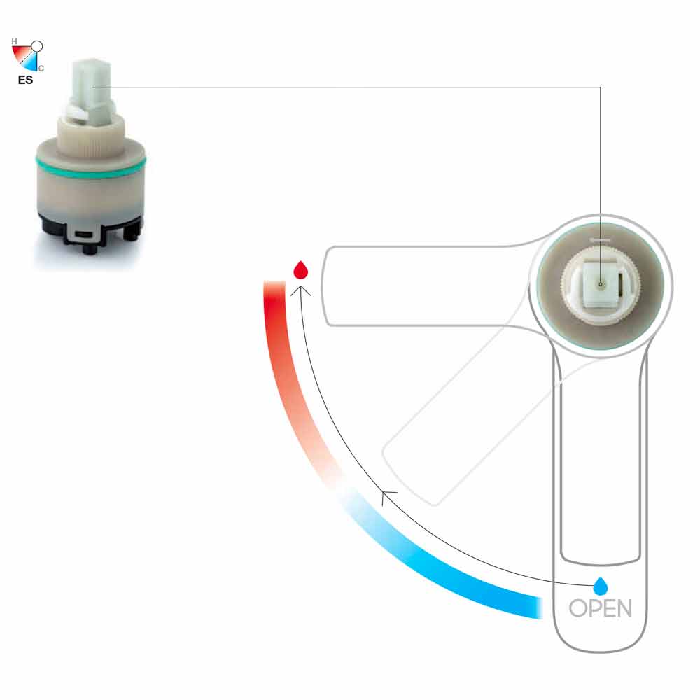 El producto también garantiza una atención adicional al medio ambiente al ofrecer 2 tipos de cartuchos diseñados y creados precisamente para ahorrar energía. El primero se llama ECO y requiere que la perilla tenga dos posiciones de apertura. En el primer bloque obtienes un caudal de agua reducido en un 50% mientras que con una apertura más ancha obtienes más agua, lo que te permite ajustar el caudal de acuerdo a nuestras necesidades evitando desperdicios. El segundo tipo ES definido suministra agua fría cuando la palanca está levantada en la posición central evitando así la solicitud de agua caliente a la caldera permitiendo así un consiguiente ahorro energético.
