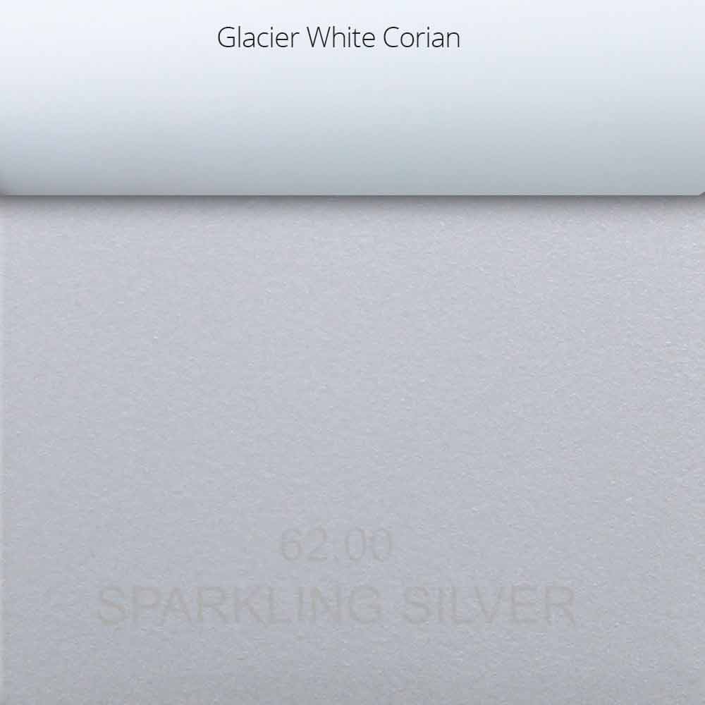 - Sparkling Silver + Glacier White Corian®: acabado metálico plateado mate con elementos DuPont ™ Corian® blancos;