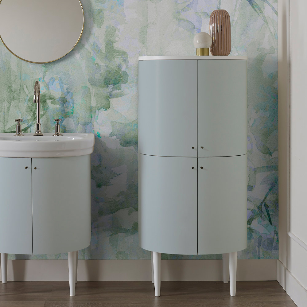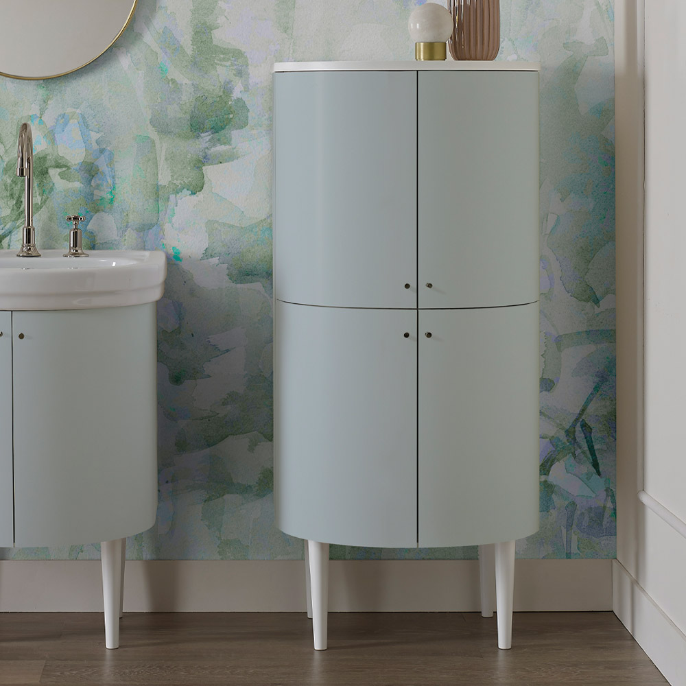 Columna de MDF con cuatro puertas acabado mate azul claro que cierran tres baldas, dos de ellas de cristal y una en Hidro MDF. El estante superior y las patas son en acabado blanco mate y se incluyen los tiradores en acabado níquel .
