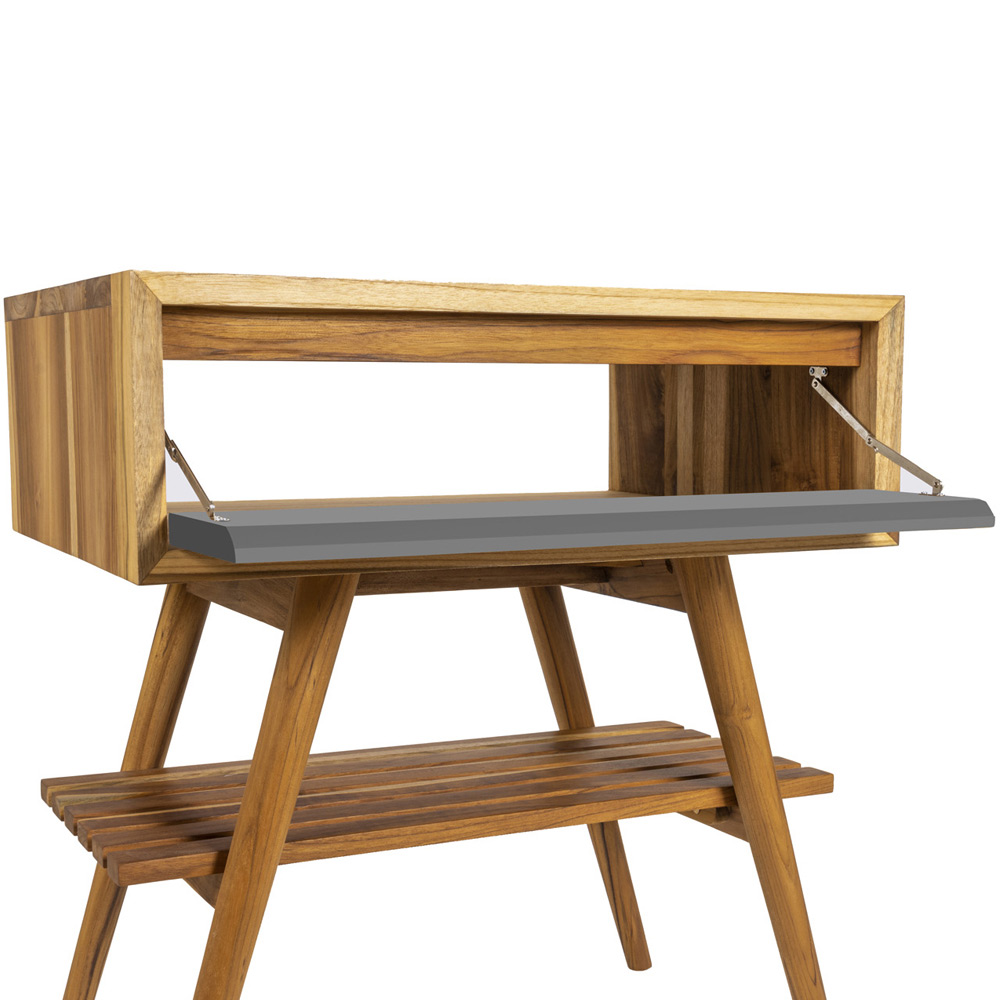 Mueble de baño de suelo de teca con cajón de caoba gris.