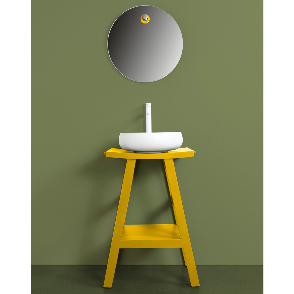 Mueble de baño de pie en teca natural recuperada pintada de amarillo , un color cálido y soleado que transmite una fuerte carga de energía, transmitiendo positividad desde la primera mirada. Su estructura se caracteriza por la forma ligeramente curvada de la parte superior que ofrece un toque exclusivo y refinado a la estética del producto. Completo con 4 prácticos ganchos para toallas y estante de almacenamiento funcional.