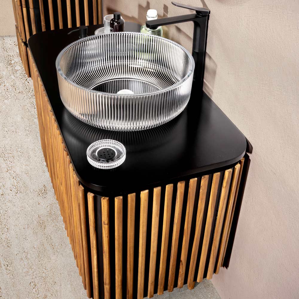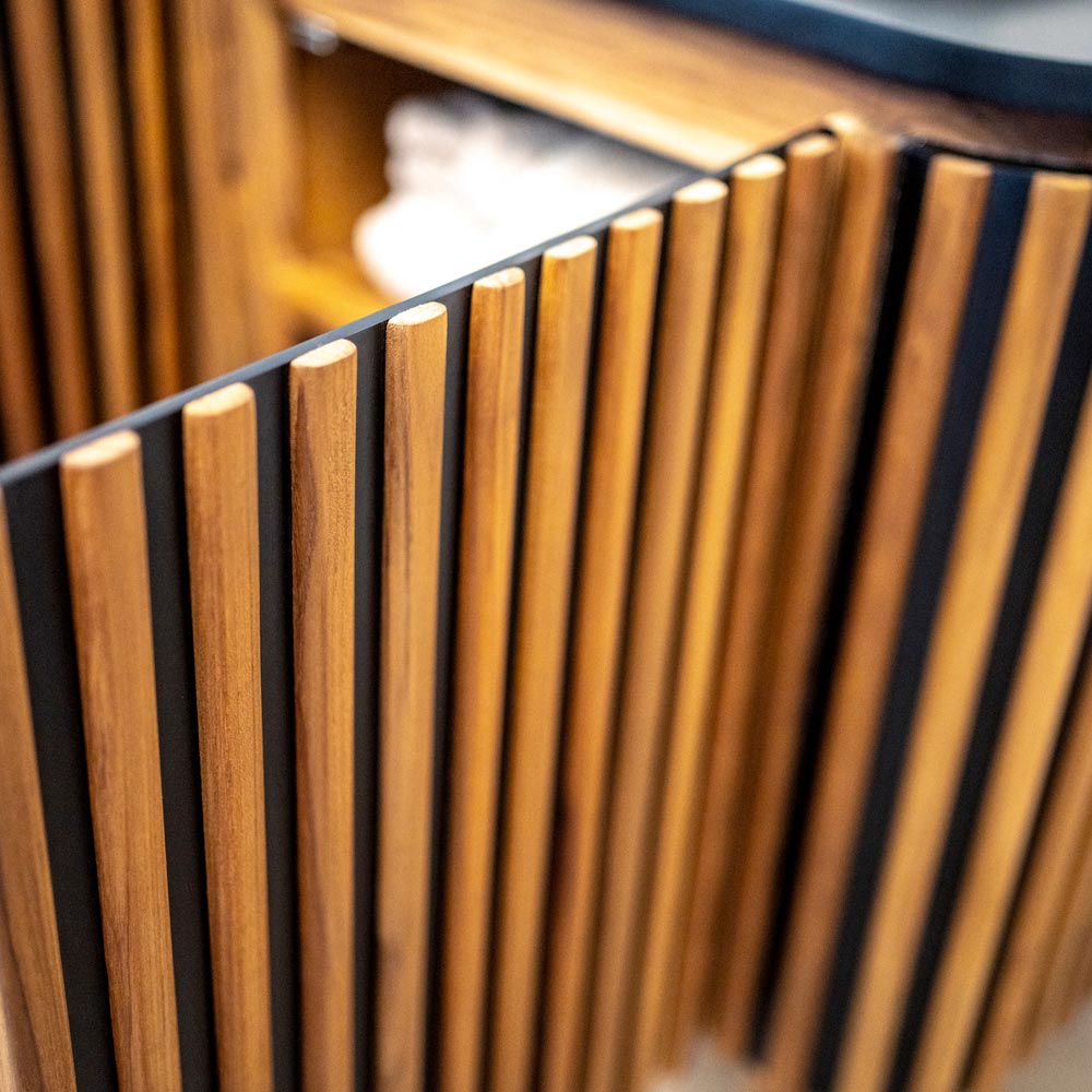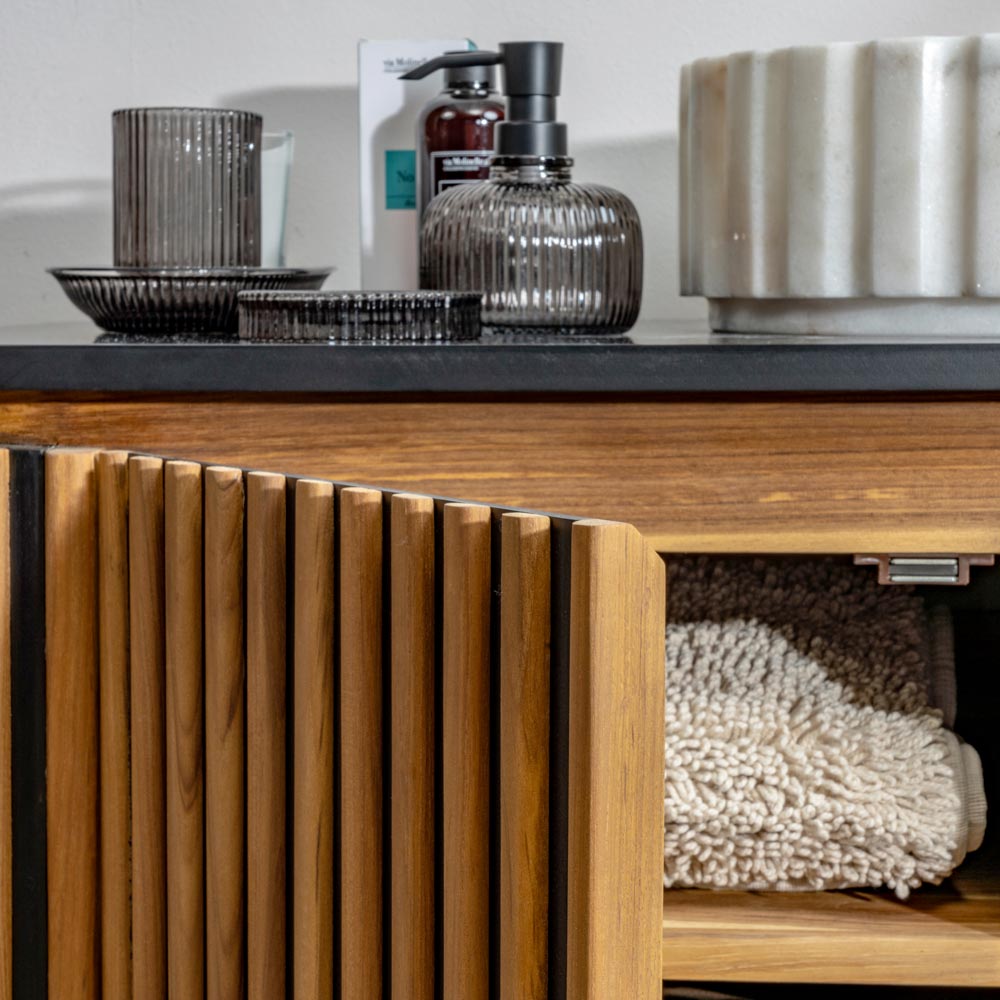 Renueva tu baño con este mueble de teca maciza y caoba , una expresión de lujo y durabilidad . El diseño lineal y geométrico de las lamas de teca se alterna armoniosamente con la calidez de la caoba, creando un complemento de decoración tan funcional como estético. Está disponible en dos tamaños versátiles , asegurando una perfecta adaptabilidad tanto a espacios amplios como íntimos. También ofrece puertas de cierre suave que añaden un toque de lujo y practicidad. El diseño permite la instalación de uno o más lavabos , asegurando flexibilidad y personalización en el diseño de su baño. Con su acabado sofisticado y líneas limpias, es el complemento ideal para quienes buscan funcionalidad, estilo y calidad sin concesiones.