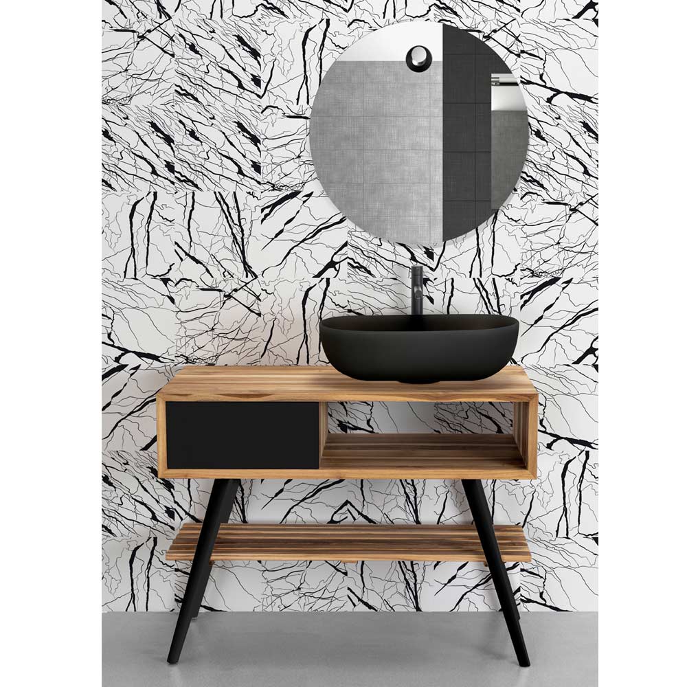 Mueble de baño de pie en teca natural reciclada con cajón en madera de caoba pintada en negro mate a juego con las patas. Una elección de color elegante y con estilo que se destaca en cada situación de decoración, haciéndola fascinante y misteriosa y revelando atmósferas exclusivas y emociones únicas. Una estética deliberadamente gráfica realzada aún más por la practicidad de sus dimensiones que la hacen perfecta para amueblar pequeños espacios que necesitan un protagonista elegante y funcional .