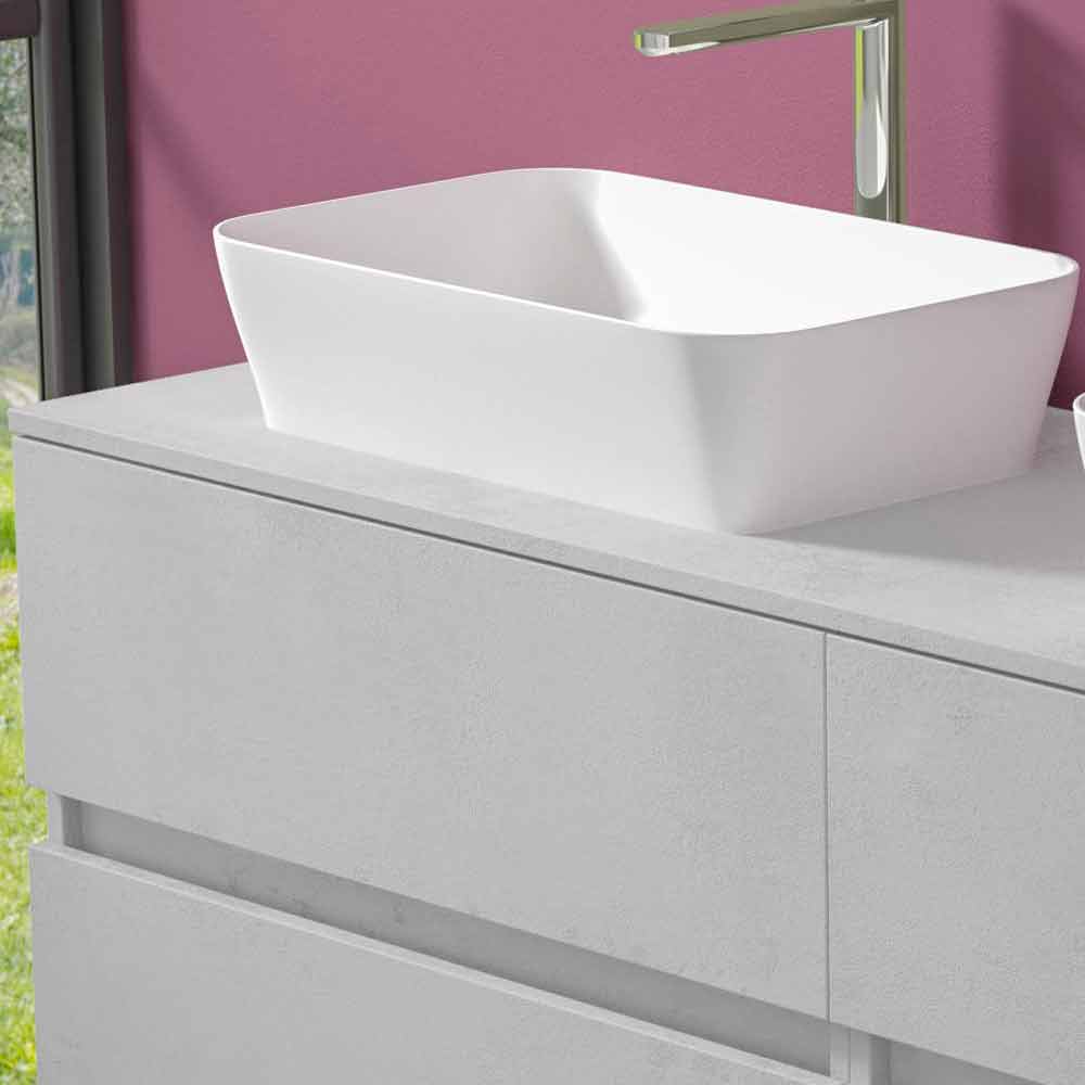 Los dos lavabos de encimera rectangulares están fabricados en Solid Matt, una resina mineral blanca opaca , y acabados en gelcoat opaco, que hace que el producto sea impermeable.