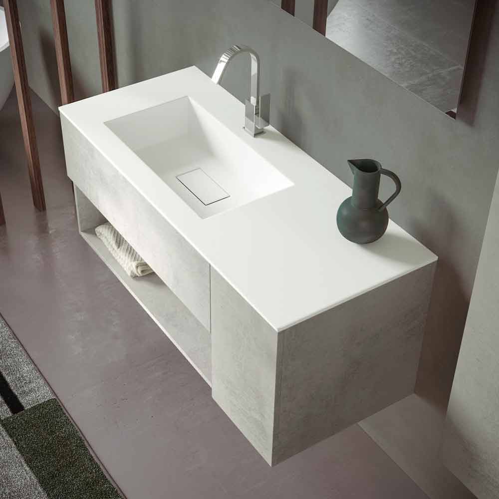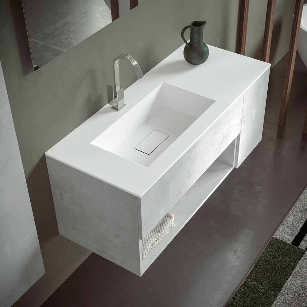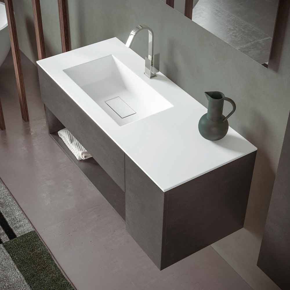El lavabo rectangular integrado está fabricado en Solid matt, una resina mineral blanca opaca , y acabado en gelcoat opaco, que hace que el producto sea impermeable.