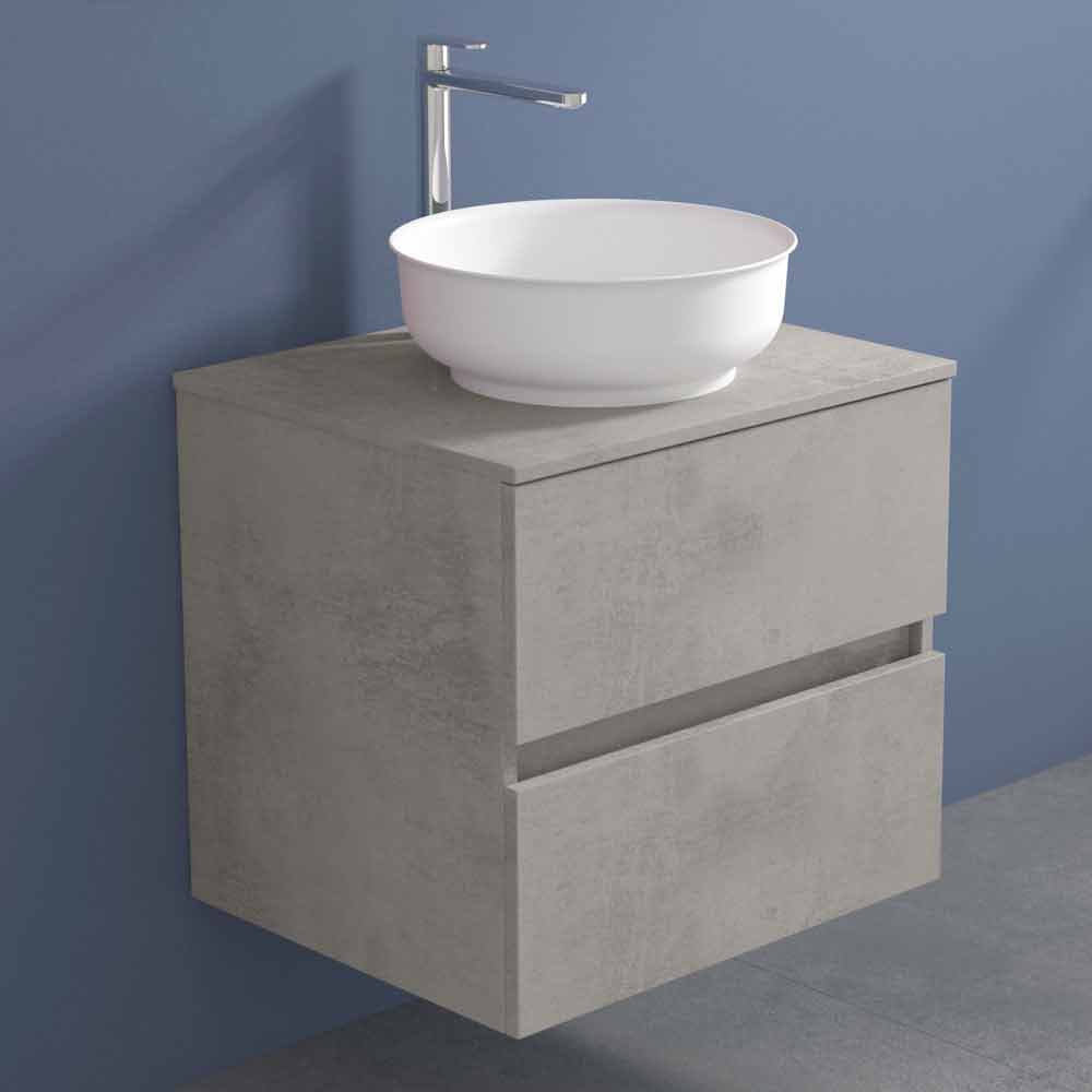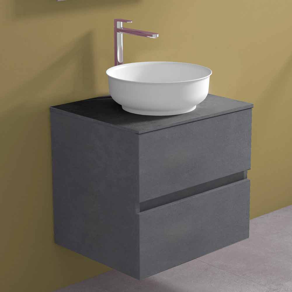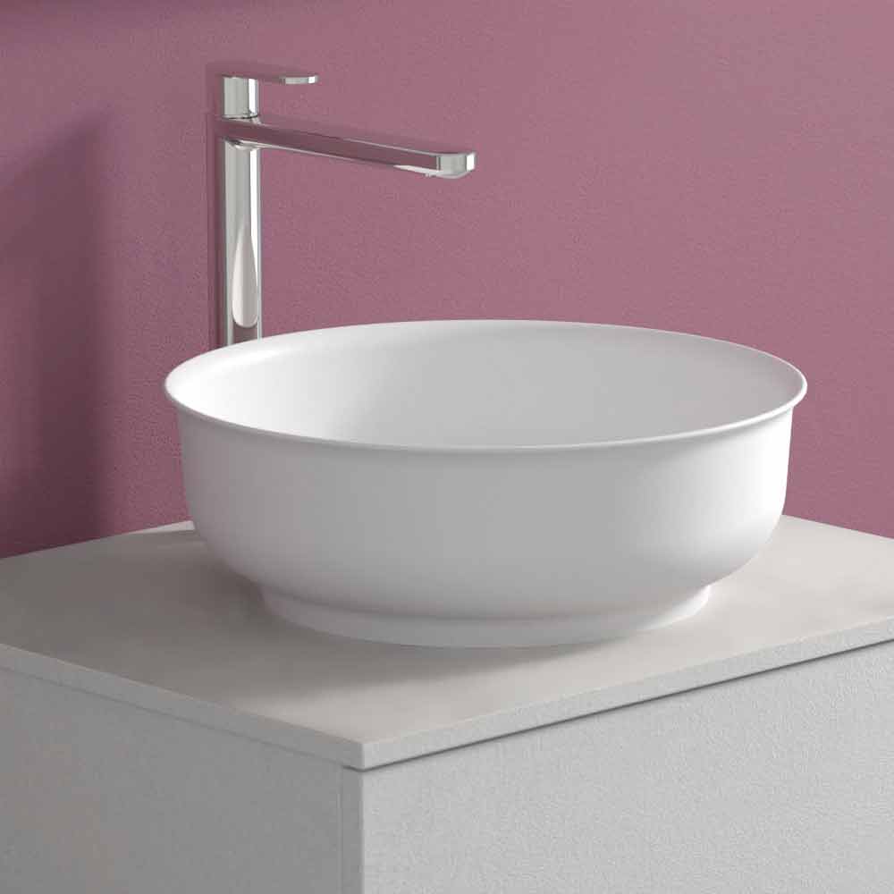 El lavabo redondo sobre encimera está fabricado en Solid Matt, una resina mineral blanca opaca , y acabado en gelcoat opaco , que hace que el producto sea impermeable.
