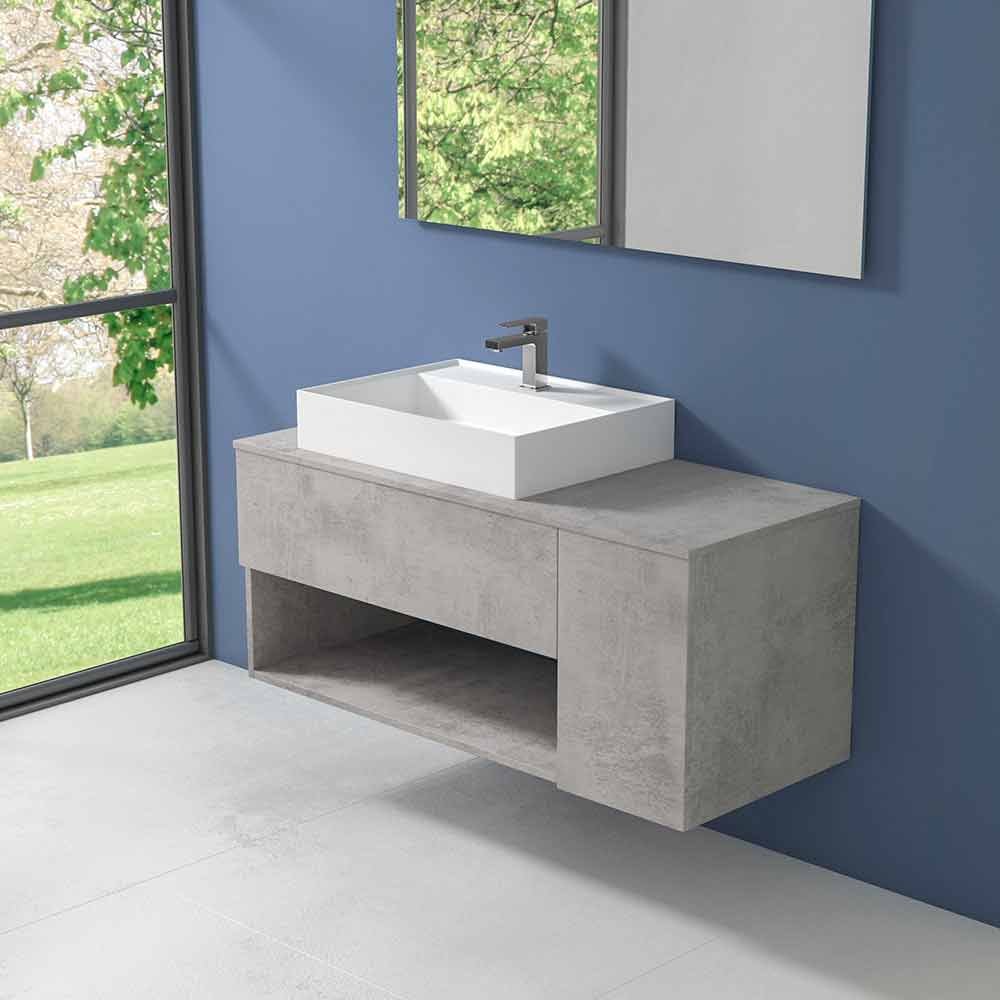 El mueble bajo lavabo con cajón y compartimento abierto está fabricado en fibra de madera laminada e hidrófuga Hydro W 100 , para garantizar una mayor durabilidad y evitar que el mueble se dañe en contacto con el agua.
