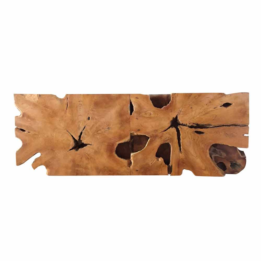 teca maciza recuperada y unida. La forma rectangular de la tapa, sin embargo, mantiene evidentes todas las características del tronco o raíz utilizada. Los nudos de la madera y los injertos de las ramas, las irregularidades del tronco y las tonalidades de color, dibujan